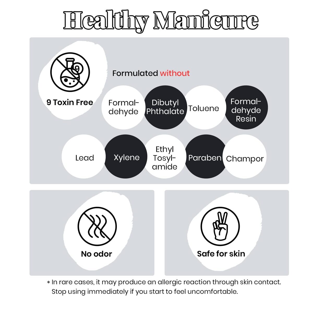 [Safety Elements] This product may cause an allergic reaction if it comes into contact with the skin. It is important to read the directions for use carefully and only apply the product to nails. Avoid contact with the eyes, mouth, and skin. In case of contact with these areas, rinse immediately with water and seek medical attention if necessary. Discontinue use of the product if redness and itching develop. Keep the product out of reach of children.