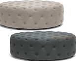 - Beige / Gray Linen Round Tufted Cocktail Ottoman Coffee Table Modern 38.5" Diam