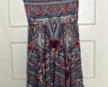 Beige by eci Fit Flare Asymmetrical Dress in Blue and Red Size M. Chic asymmetrical dress with intricate patterns. Features a sleeveless design and vibrant colors. Ideal for stylish outings. This cute dress is 95% Polyester, 5% Spandex and Machine Washable. Armpit to armpit measures 18?. Waist is 28?. Shoulder to hem is 47? at the points. Very Good Condition - See photos for further description.