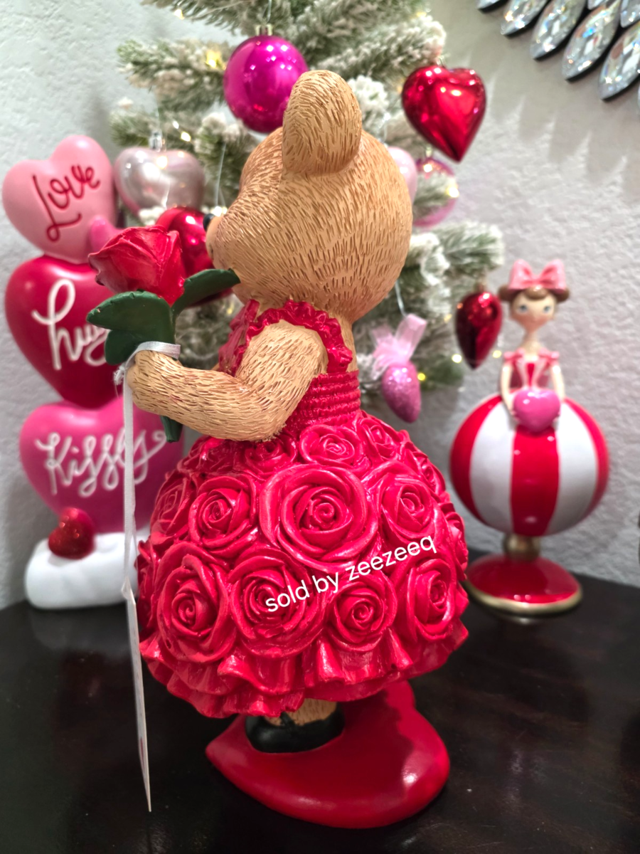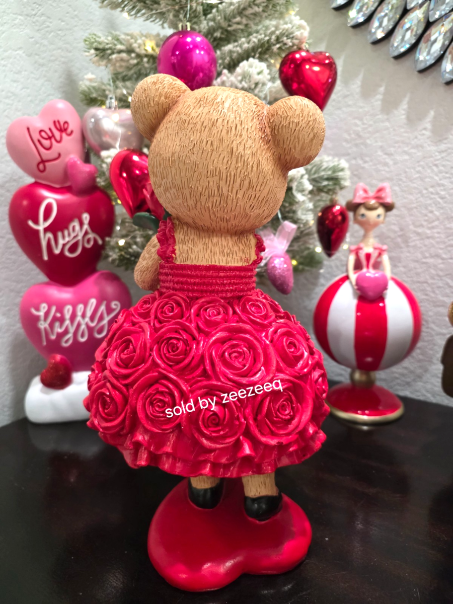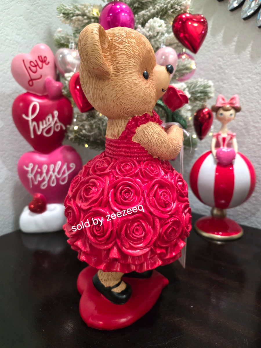 Bella Lux Valentine's Bear Wearing Red Rose Dress Resin Figurine Decor 12”