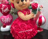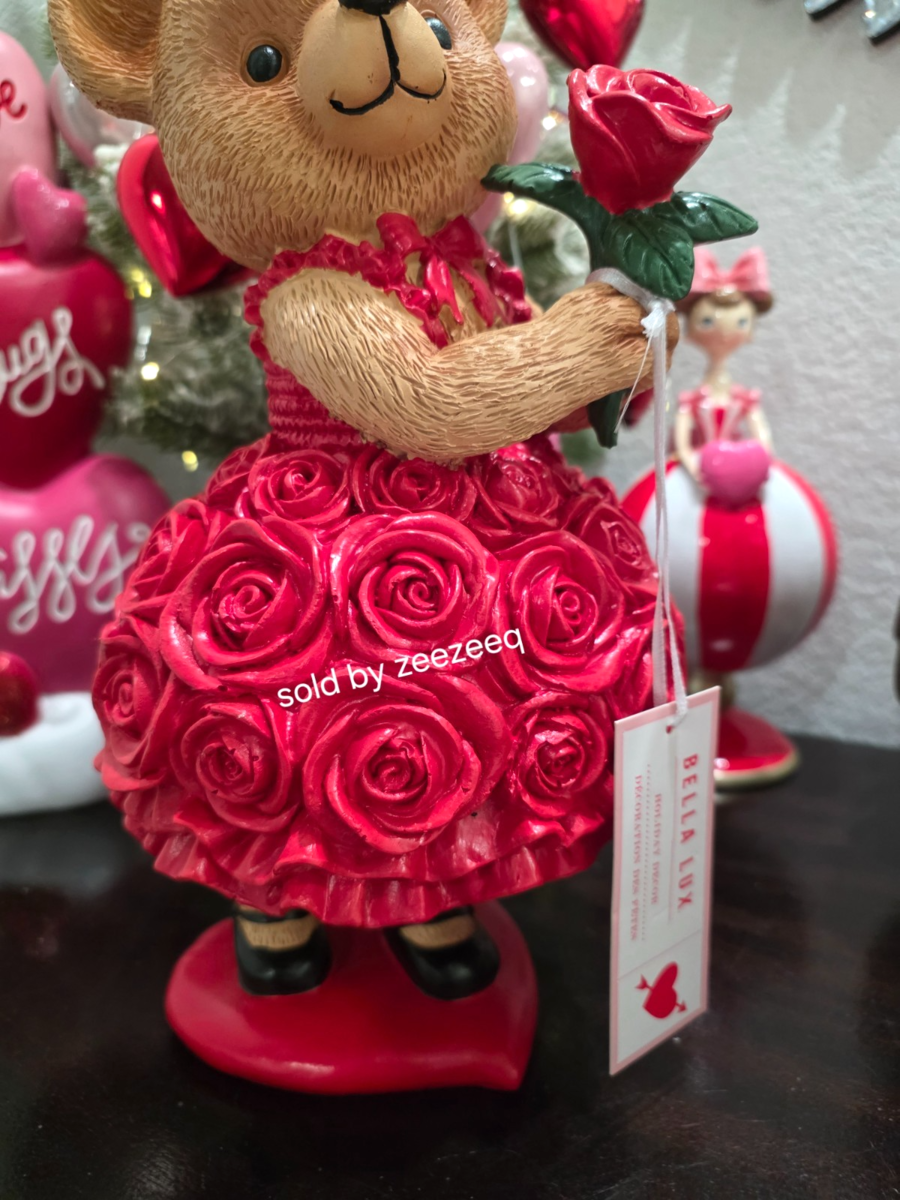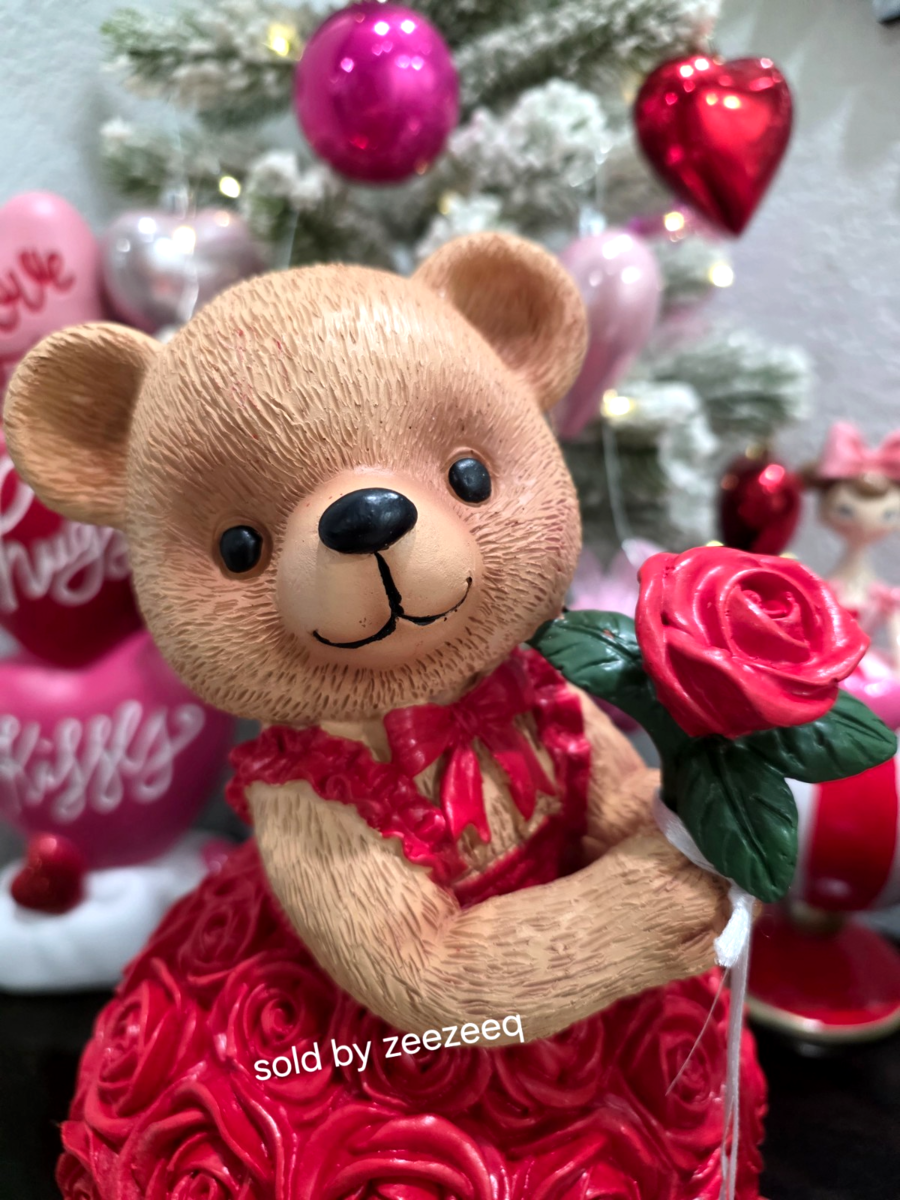 Up for sale we have this adorable bear for your Valentines decor. She is sooo cute! She is wearing a red dress made of roses. Made of resin it stands approx 12" tall. Soooo cute!! New Background items are available in my store.