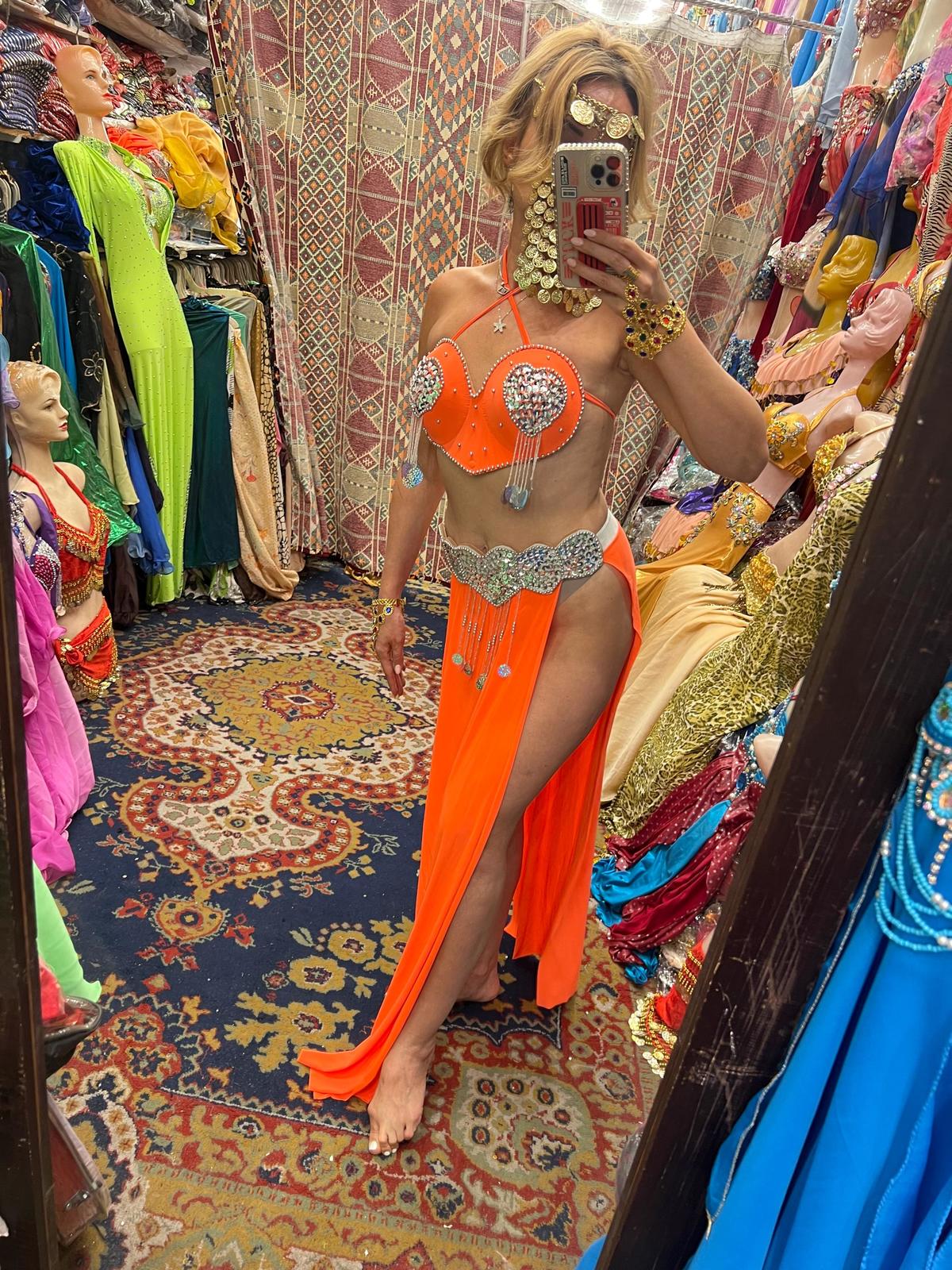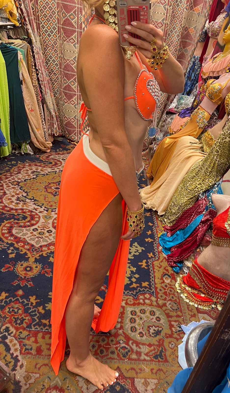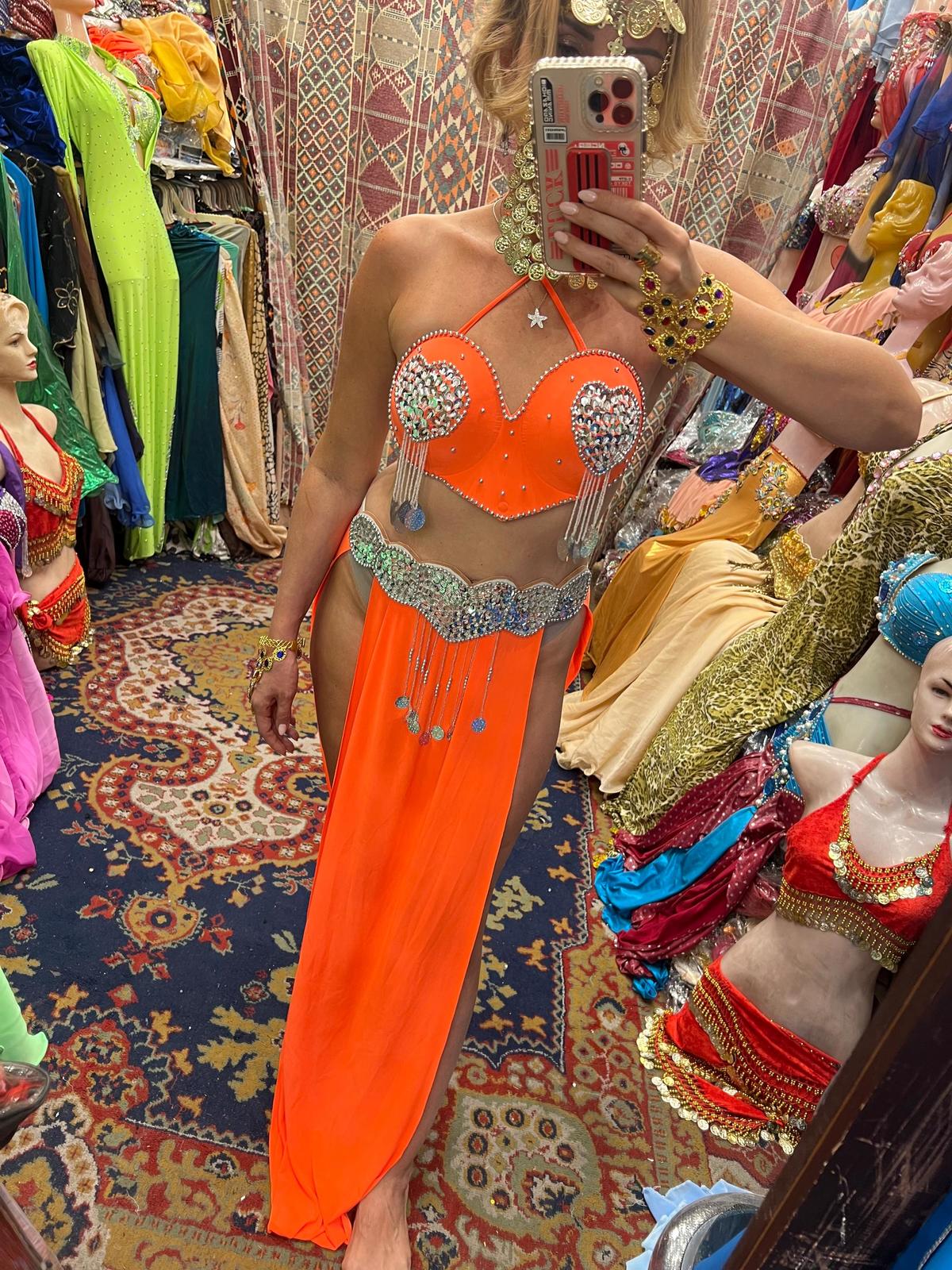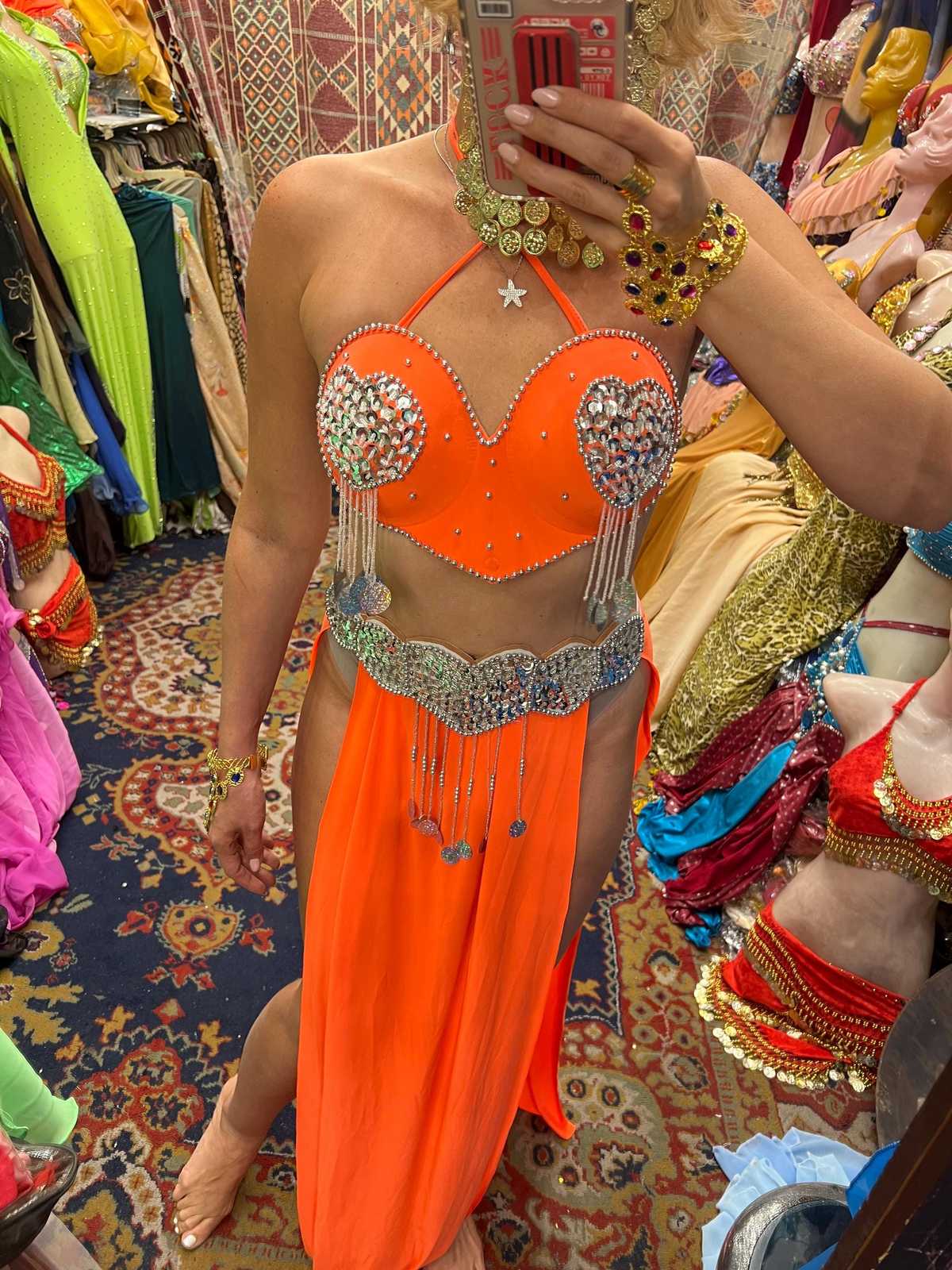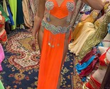 Not only is this costume a feast for the eyes, but it also embodies the spirit of celebration and artistry inherent in belly dance. The hand-sewn beads glisten brilliantly, adding an extra touch of glamour that is bound to make heads turn. With its vibrant colors and luxurious materials, this dress is not just a costume; it's an experience.