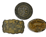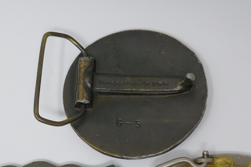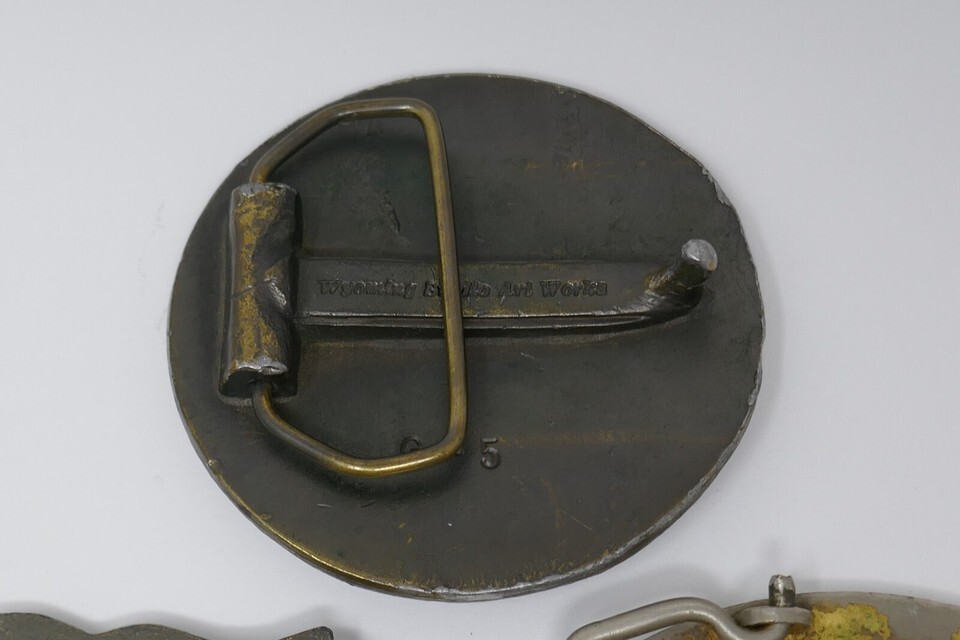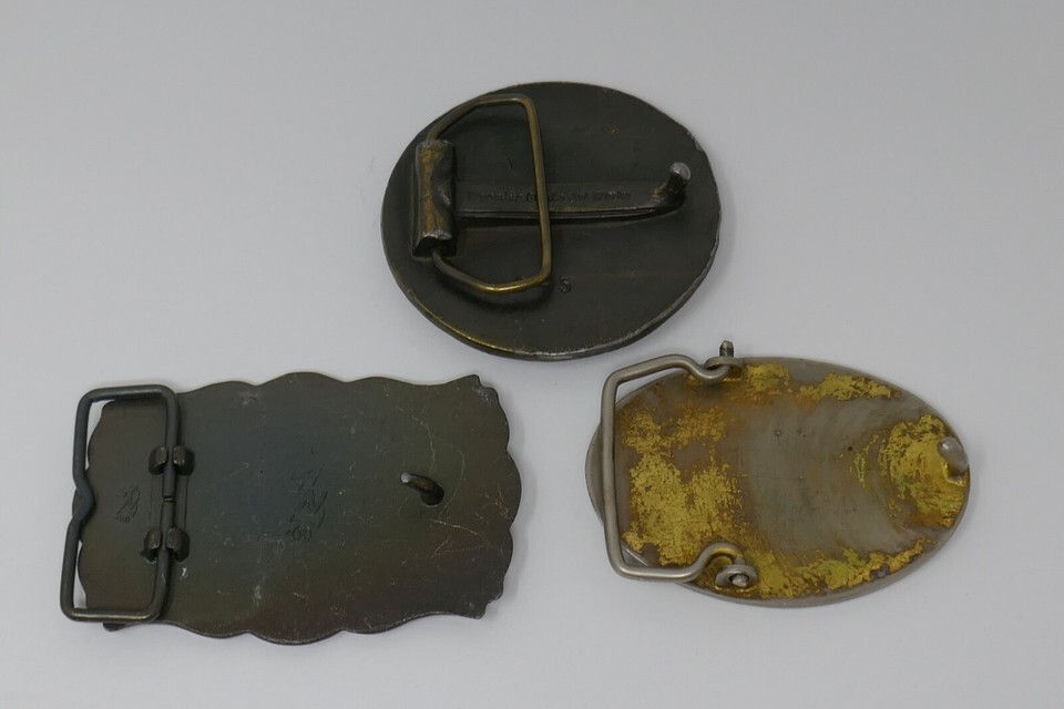 Up for sale is a lot of 3 Belt Buckles. The round buckle is made by Wyoming Studio Art Works and says NRA National Defense Arms and the Man, this measures approx. 2.75" wide. The rectangular buckle measures approx. 3.375" wide and 2.125" tall with a Bear Deer and Buck. The oval buckle measures approx. 3" wide and 2" tall and says Hunter Education State of Michigan DNR. These all have some wear.