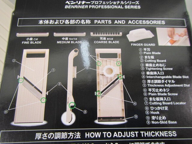 Three types of replaceable blades (small, medium, and rough teeth) can be used for both the old type "Benriner" and the new type.