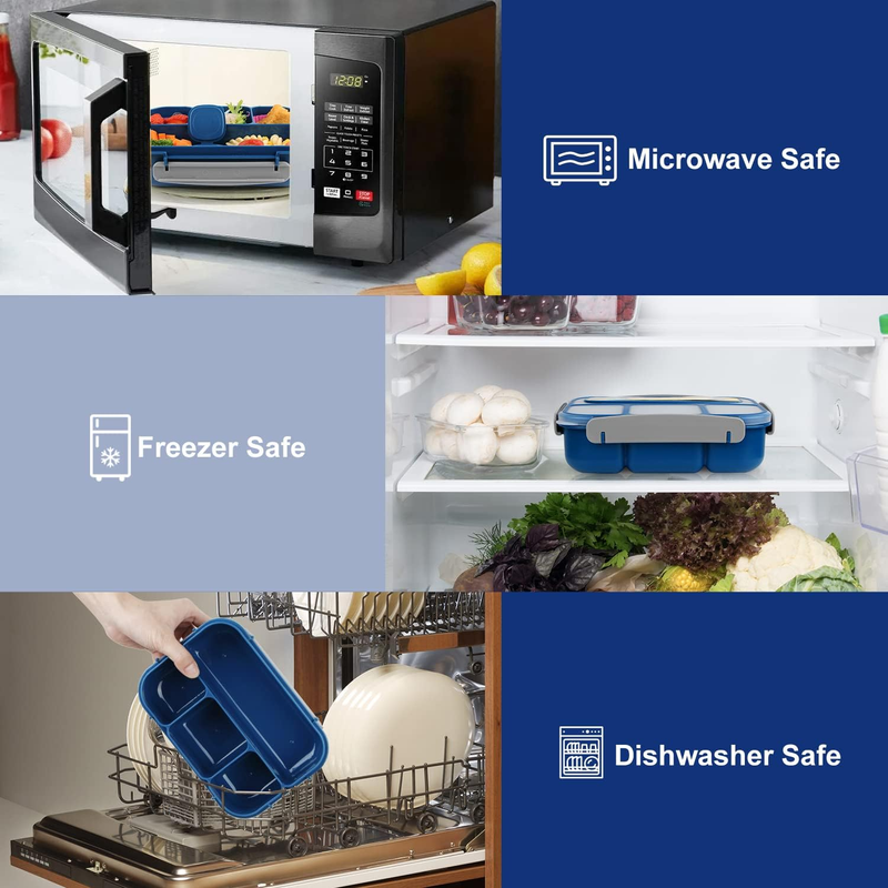 ?Easy clean?It is very easy to clean (just throw it in the dishwasher) and the compartments in the lunch box are of ample size.Freezer safe,Microwave safe for reheating your prep meal.(Please remove the lids before heating in the microwave)