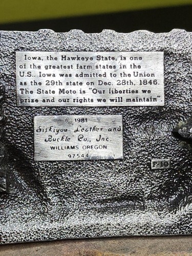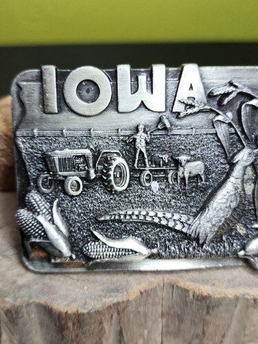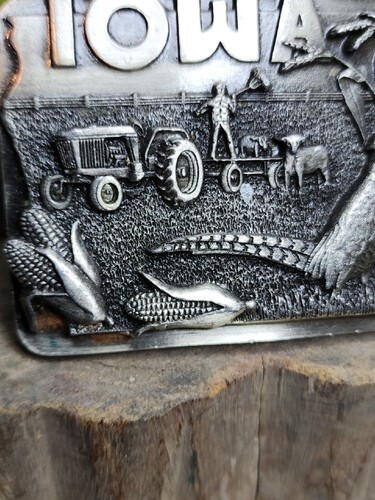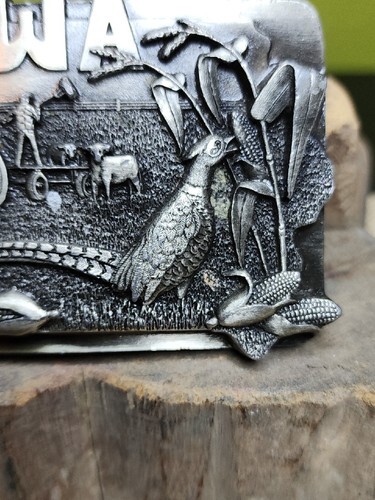 - Bergamot Brass Works Belt Buckle VTG USA IOWA 1981 Farmer Tractor Corn Pheasant