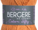 Bergere De France Coton Fifty Yarn. This fine, but not too fine, round yarn yields an even knit in basic stitches and is easy to care for. Weight category: 2. Content: 50% cotton/50% acrylic. Putup: 1.75ox/50g, 153yd/140m. Gauge: 26sx37r = 4in/10cm on size 3mm knitting needles. Dyelotted: we try but are not always able to match dyelots. Care: machine wash, machine dry, do not bleach, press, dry clean using P solvents. Comes in a variety of colors. Each sold separately. Imported.