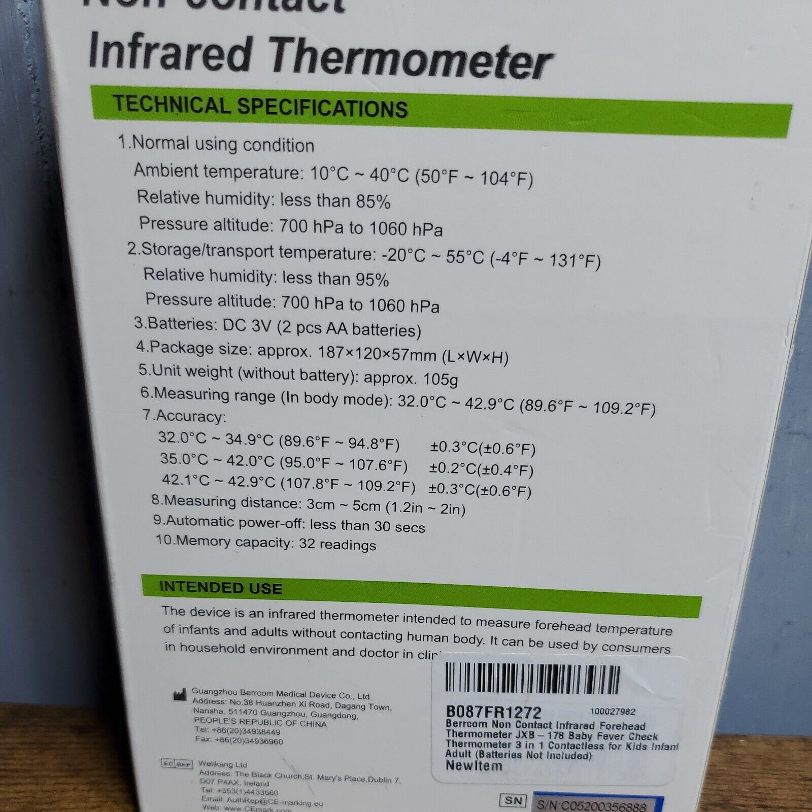 - Berrcom JXB-178 Non-Contact Infrared Forehead Thermometer
