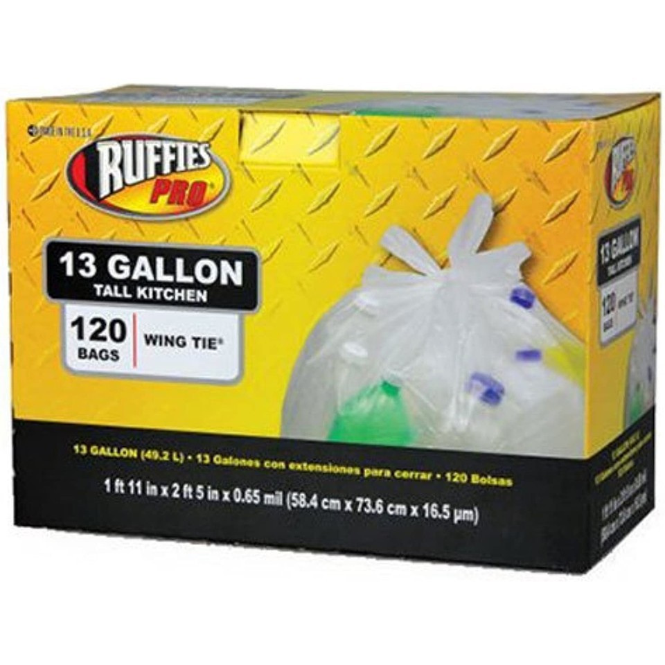 Ruffles, 120 count, 13 gallon, .65 mil, clear, wing tie, tall kitchen recycling bags, 23" x 29", boxed. This are easy to use. This are highly durable.