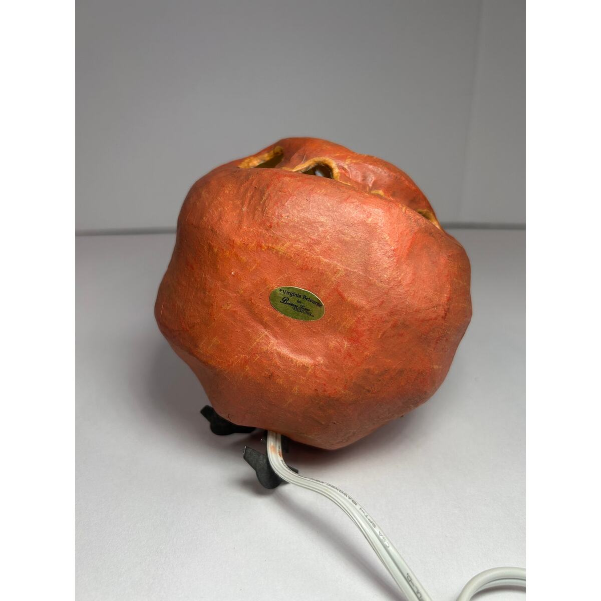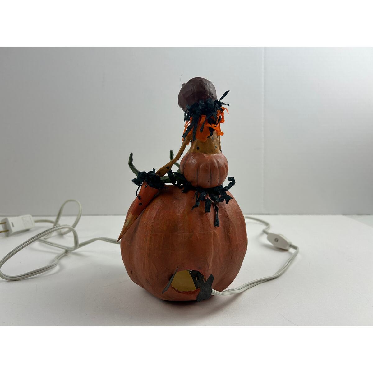 Whimsical Bethany Lowe Halloween light featuring a smiling jack-o-lantern base with an elfin figure on top, designed by Virginia Betoine. Crafted in papier-mache with a hand-painted finish, it glows warmly when lit for a perfect vintage-style display piece.