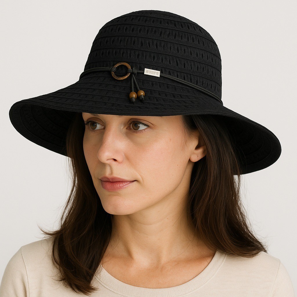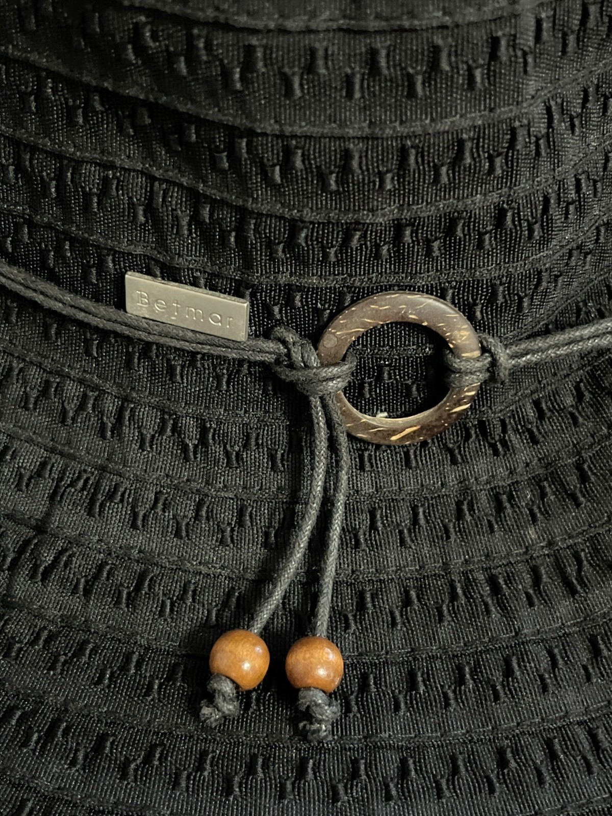 Chic and lightweight sun hat by Betmar New York, crafted from woven black polyester for breathable comfort. Features a decorative cord band with a textured ring accent and two wooden beads for a subtle boho touch. Ideal for travel, outdoor events, or casual wear during sunny days.