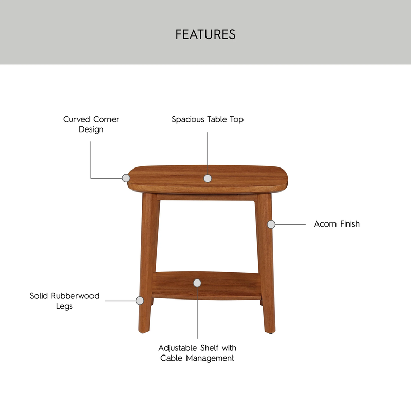 Made with solid rubberwood for long-lasting durability Warm acorn finish complements mid-century and modern spaces Open lower shelf for accessible storage or display Curved corners add a soft, family-friendly touch Spacious tabletop for drinks, lamps, or decorative accents Easy to pair with sofas, armchairs, or accent chairs Product Dimensions: 23.5 in W x 15.5 in D x 22.25 in H (59.7 cm x 39.5 cm x 56.4 cm) Product Weight: 22 lb Packaging Dimensions: 27.5 in x 19 in x 7.75 in Packaging Weight: 24.2 lb (10.9 kg) Model# BH6525004710005