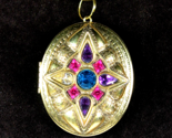 Hanging from a goldtone snake chain is this large Oval Locket! The locket has a raised four-point star design on the front which is adorned with different rhinestones!