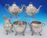 - Bigelow Kennard Coin Silver Tea Set 5pc w/3-D Flower Finials Lion Paws (#3663)