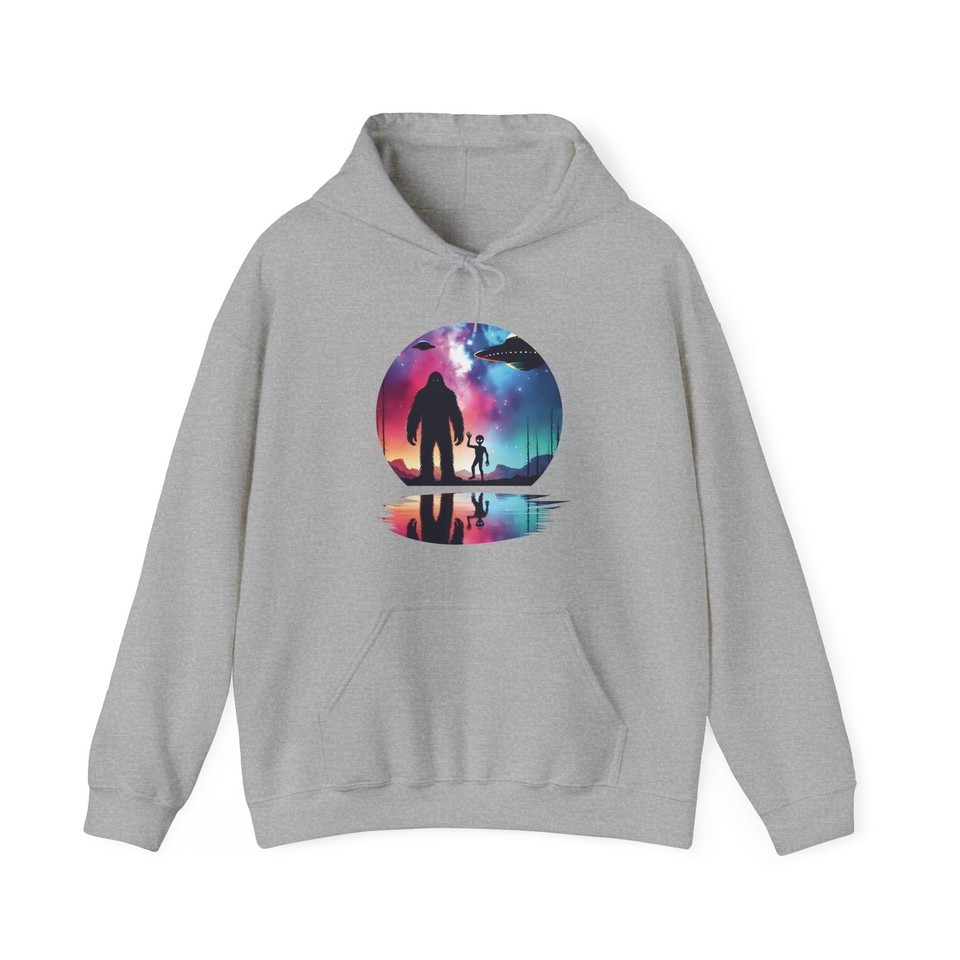 Bigfoot and Alien Hoodie, Sasquatch Space Sweatshirt, Cryptid UFO Pullover
