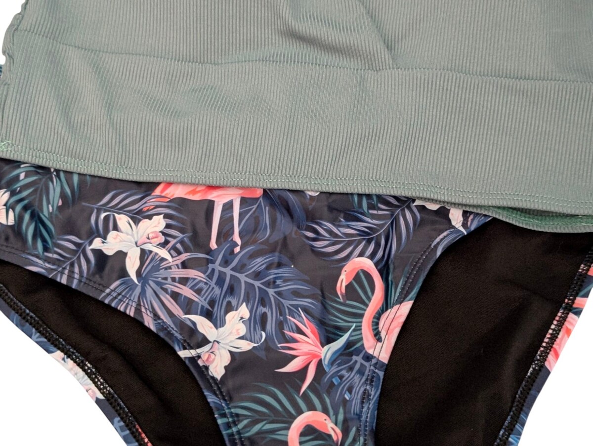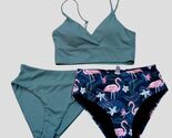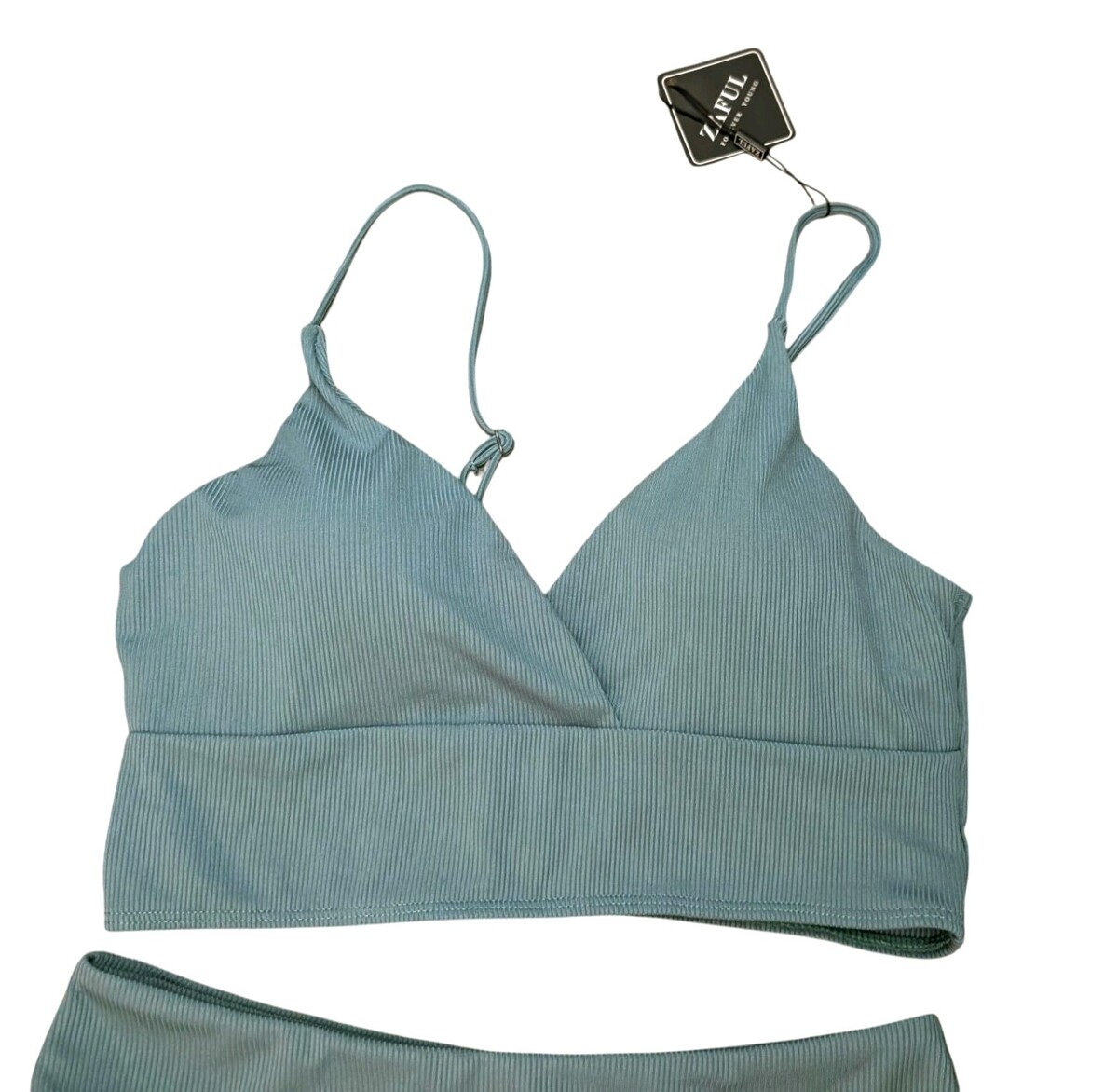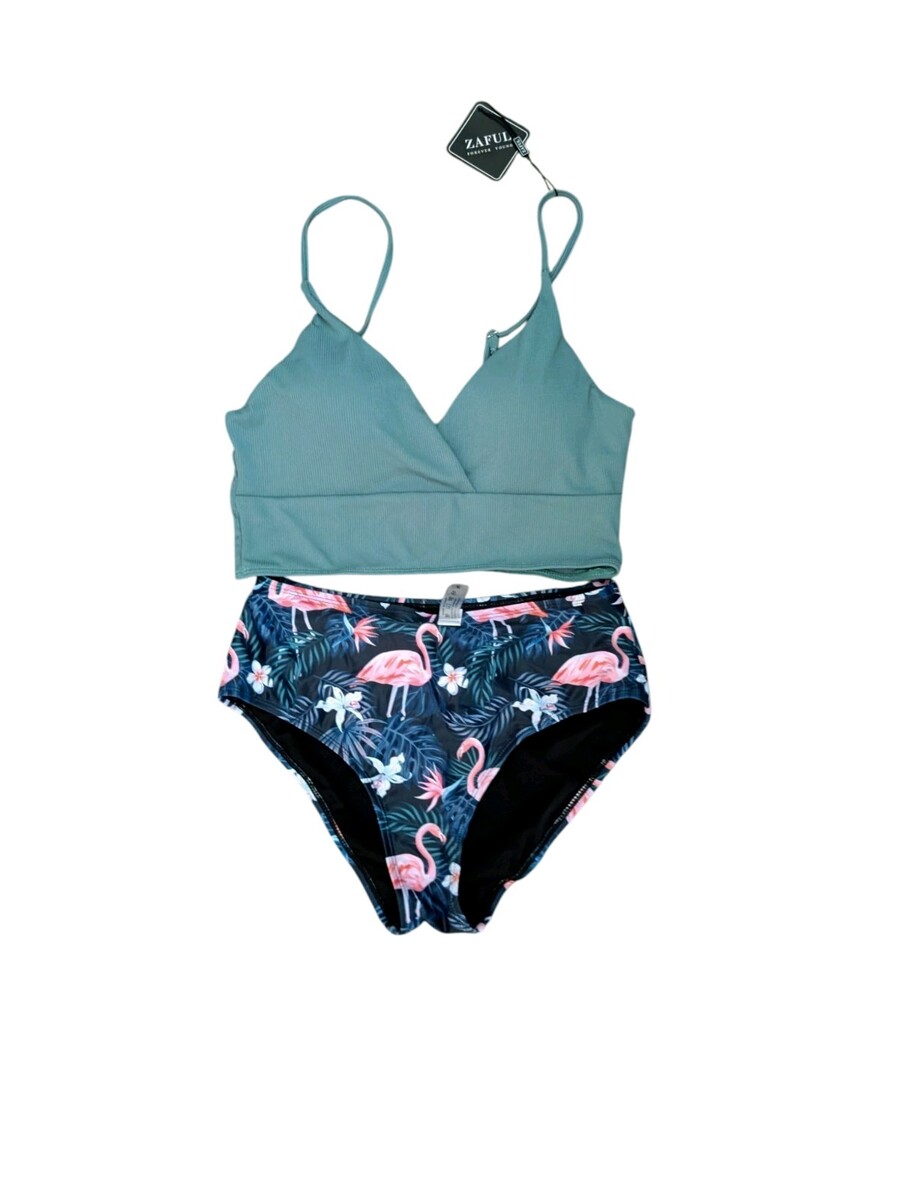 This is a beautiful brand new Zaful Forever Young three-piece bikini set. Size medium. Comes with two bottoms and one top. The one is a pattern bottom. The matching top and bottom is a ribbed material that is two ply. The color is a little bit difficult to capture correctly in the pictures. It's a very dark sage green color. Super pretty! Very figure. Flattering. Brand new with tags