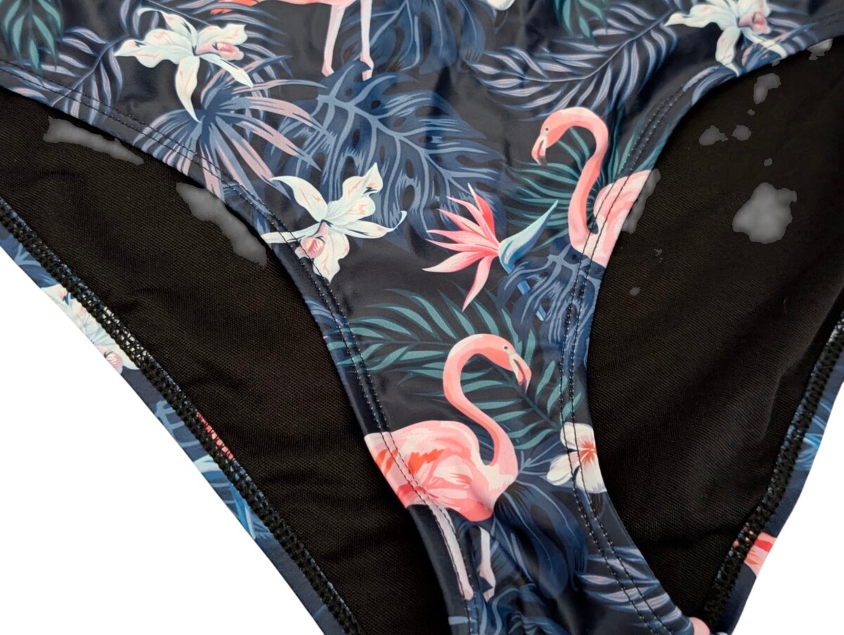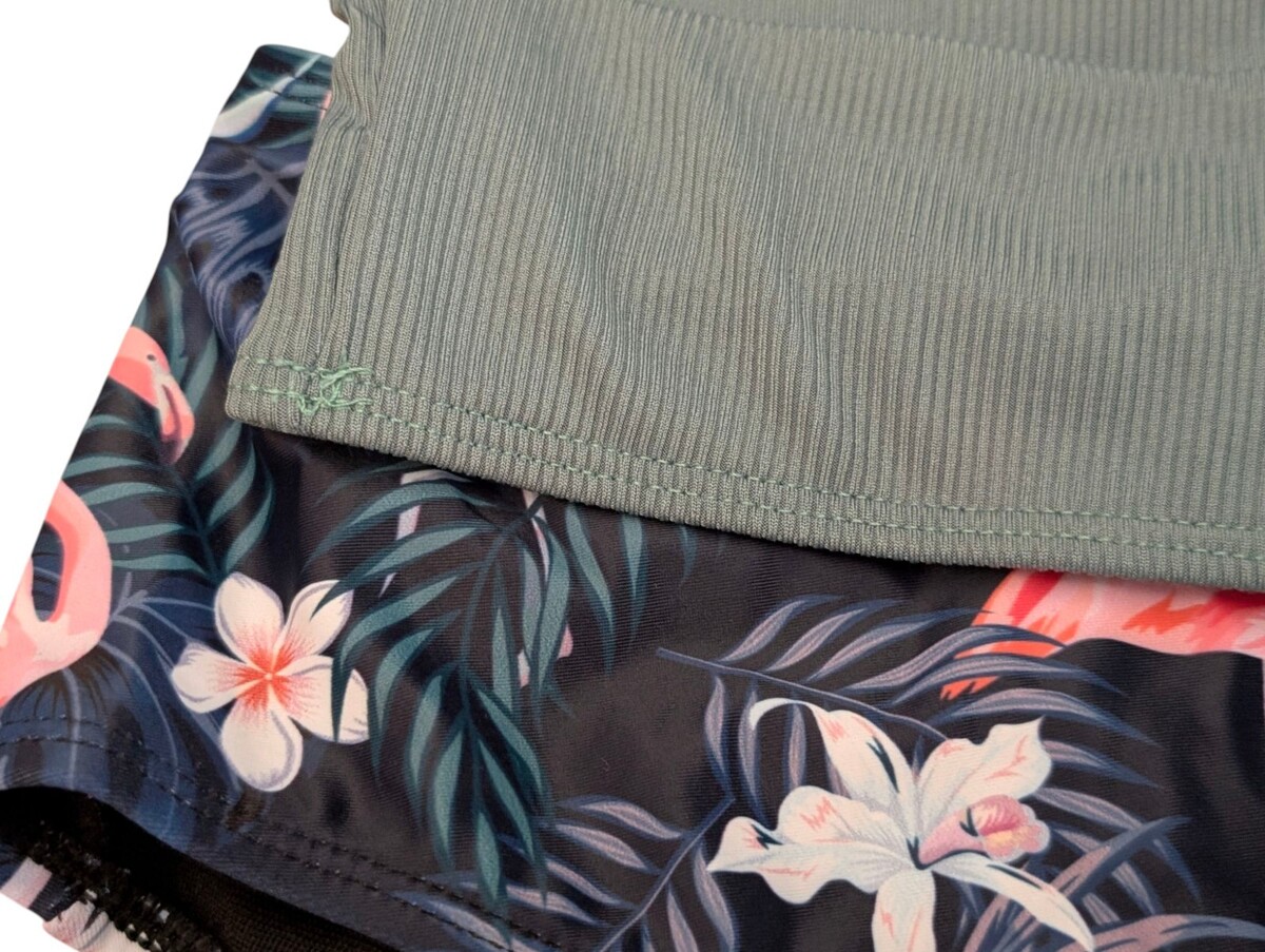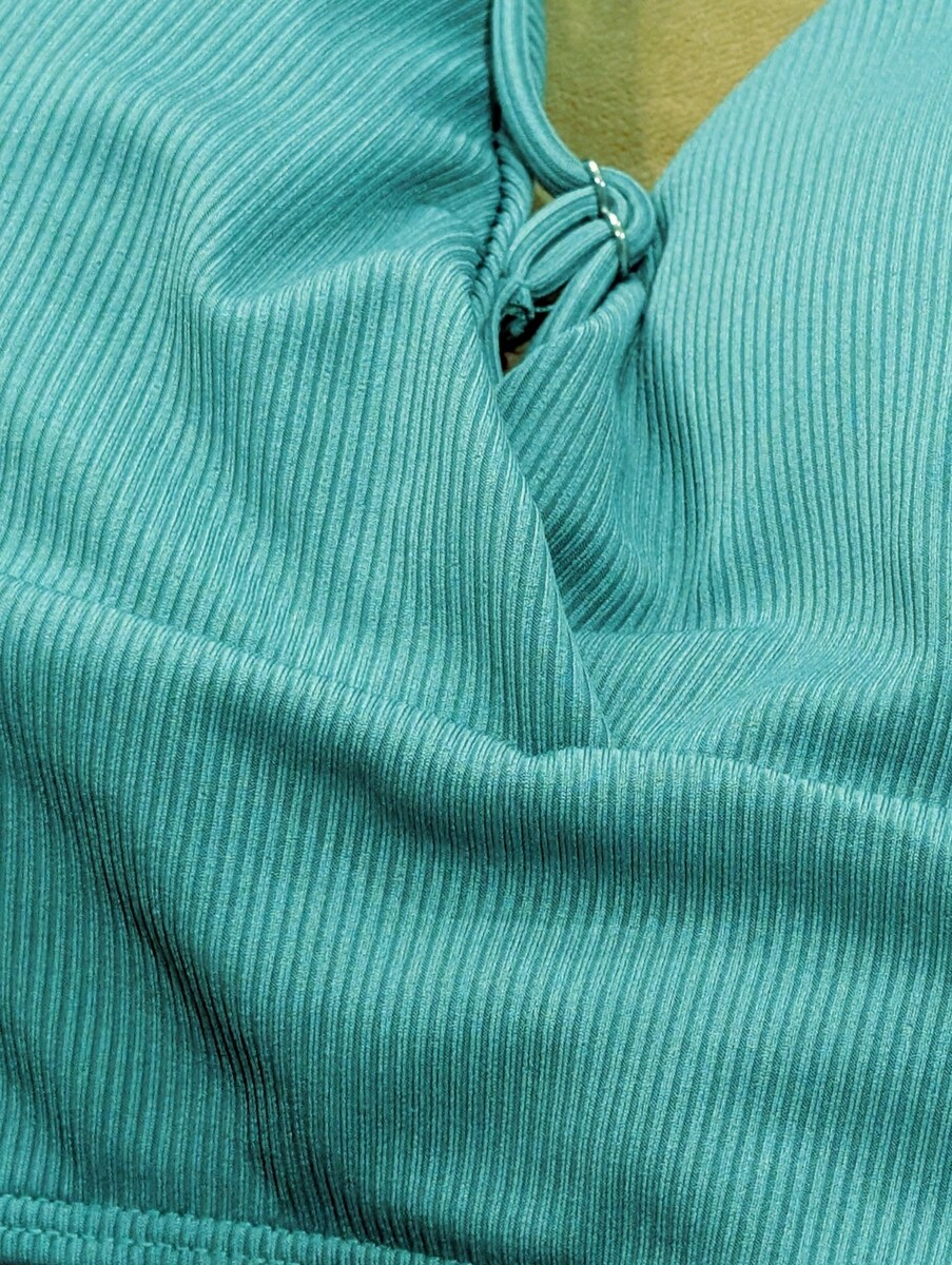 This is a beautiful brand new Zaful Forever Young three-piece bikini set. Size medium. Comes with two bottoms and one top. The one is a pattern bottom. The matching top and bottom is a ribbed material that is two ply. The color is a little bit difficult to capture correctly in the pictures. It's a very dark sage green color. Super pretty! Very figure. Flattering. Brand new with tags