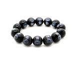 - BLACK AGATE WRIST MALA w LOTUS 14mm Buddhist Prayer Bead Stone Stretch Bracelet