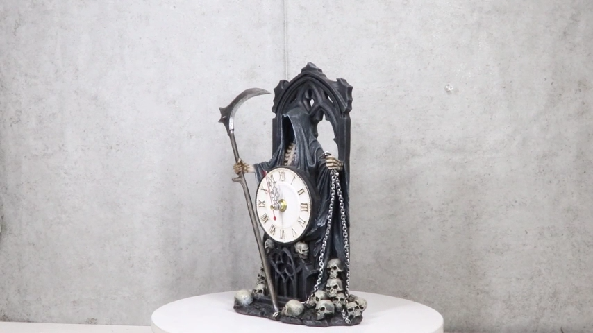 ? This Grim Reaper Table Clock figurine is made of designer composite resin, hand painted and polished individually. Color Tone may vary slightly from pictures.