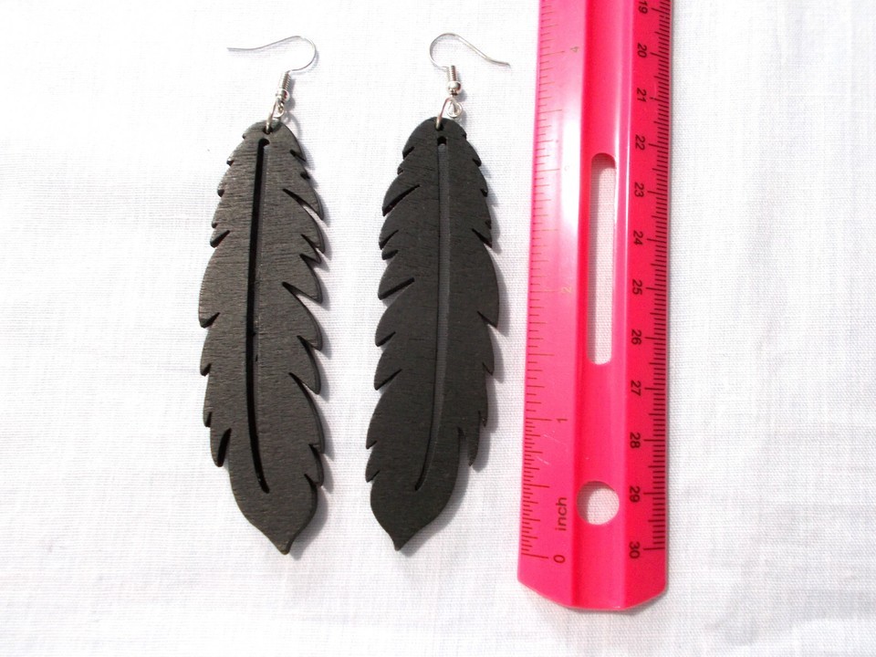 - BLACK FEATHER CUT OUT SILHOUETTE WOOD WOODEN 4" DROP PAIR OF EARRINGS