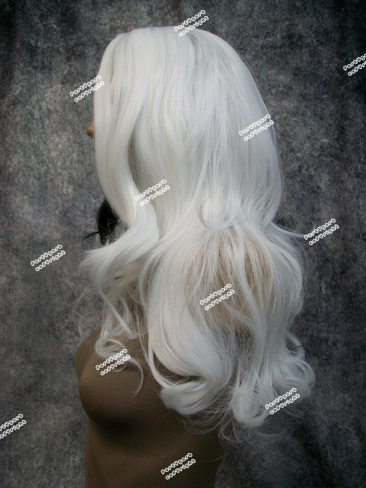 Long Wavy Layers. Flesh tone scalp look in top center part of the cap. Tangles easily. Expect shedding. Adjustable straps on cap. Kind of hangs in the face. Can be pinned back if desired. Hair pins not included. Has a small patch of shorter white hair on the front of the black side. Cap can be seen easily on the white side so additional styling will be required to conceal it. Adult Use. One Size Fits Most.