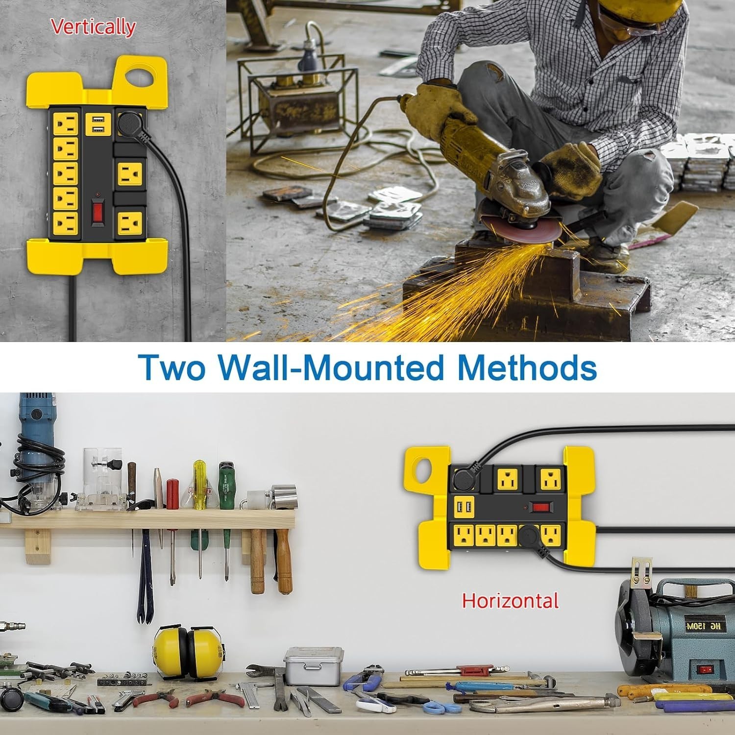 Experience ultimate power and safety with our Metal Industrial Power Strip. Featuring a robust black aluminum housing and sleek black outlets, this wall-mountable strip includes built-in USB ports (5V/2.1A) for convenient charging. With a heavy-duty rating of AC 15A 125V 60Hz 1875W, an overload-protected 15A circuit breaker, and a fire-resistant coating, it ensures reliable performance. The surge protector 2700J safeguards your devices from larger surges, while the 10FT 14AWG/3C power cord with a Velcro cable organizer keeps your workspace tidy. Designed with three wide-spaced outlets for larger plugs, two hanging holes for easy storage, and keyed back for effortless wall mounting, this -listed power strip is perfect for workshops, garages, or indoor use. Built to last and focus on safety, it's your ideal power solution.