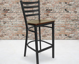 Create a first-rate dining experience by offering your patrons great food, service and attractive furnishings. Commercial furniture needs to be both durable and low maintenance so metal barstools are a popular choice for furnishing restaurants, pool halls, lounges, bars and other high traffic establishments. This stool is easy to clean, which is an important aspect when it comes to a business. Built to withstand the everyday hustle and bustle in the restaurant and hospitality business, these dining stools will also look great in your home. The beautiful wood seat and ladder back design will keep guests comfortable. The frame is stabilized using two welded support bars, which includes a footrest to prevent leg discomfort. The floor glides help protect your floors and ensure smooth gliding. Use this bar height stool in your kitchen, dining room or home bar and give your decor a fresh look. The simple and lightweight design of this stool will not disappoint, whether used in the home or your commercial business. [XU-DG697BLAD-BAR-MAHW-GG] Dimensions: 17"W x 18"D x 42.25"H