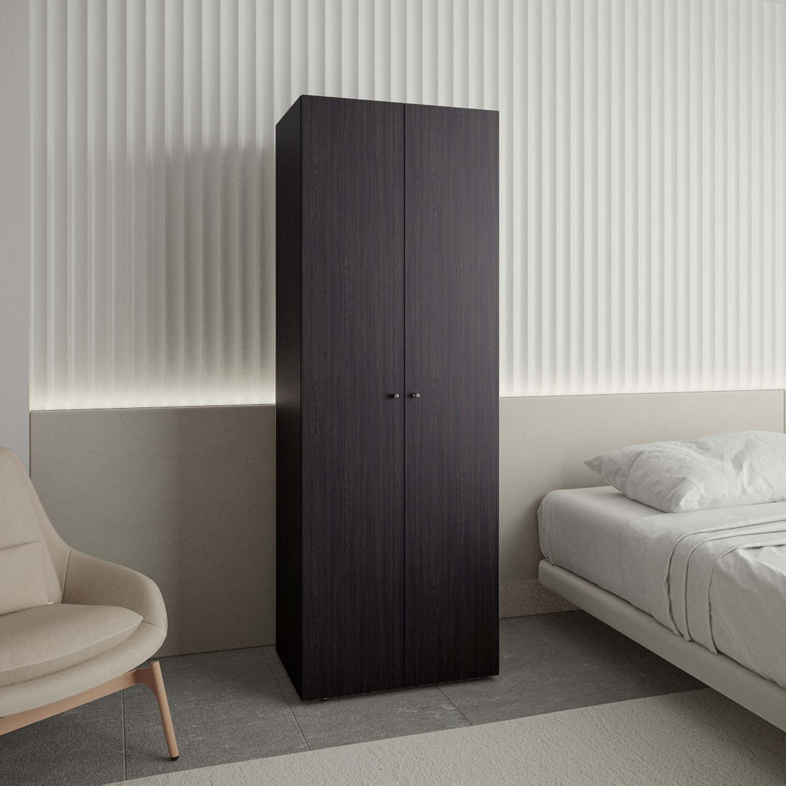 2-door vertical armoire provides generous enclosed storage, keeping clothing and accessories out of sight while helping maintain a tidy bedroom space.