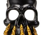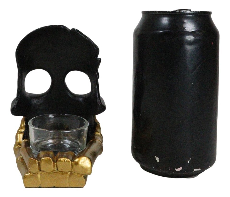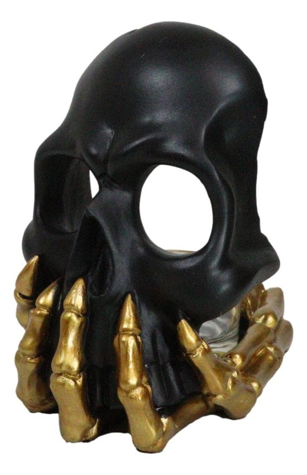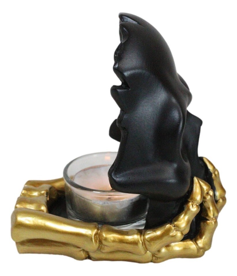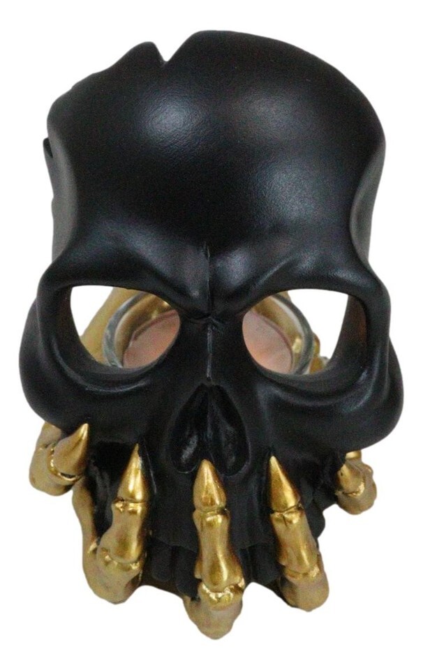 - Black Phantom Skull Mask On Gold Skeleton Hand Votive Tea Light Candle Holder