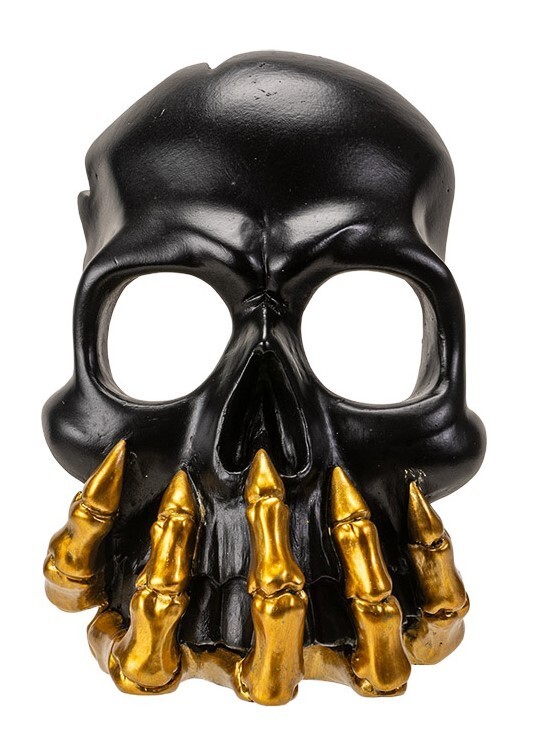 ? Step into the mysterious world of the Black Phantom Masquerade Skull with Gold Skeleton Hand, a dark and macabre votive tea light candle holder that exudes an air of Gothic elegance. This intricately crafted piece features a phantom masquerade skull adorned with a gold skeleton hand, creating a striking contrast that adds an element of mystery and sophistication to your space. Perfect for lovers of the macabre and Gothic aesthetics, this candle holder is both functional and ornamental.