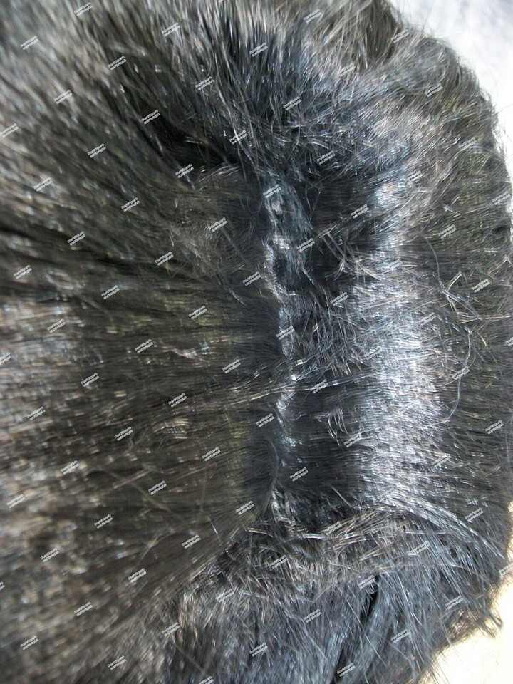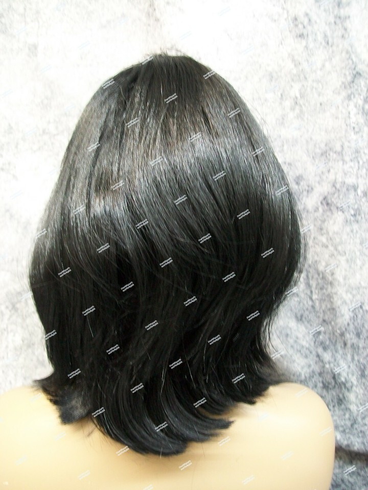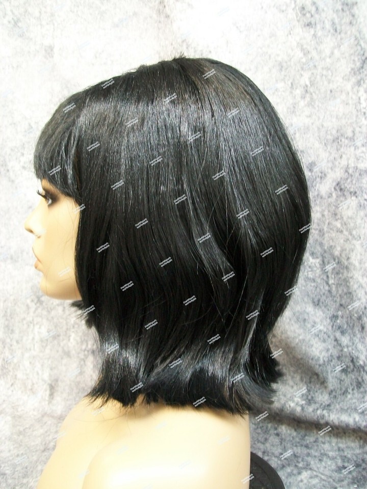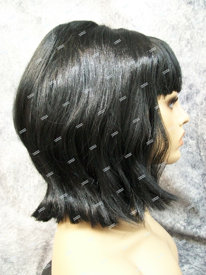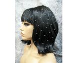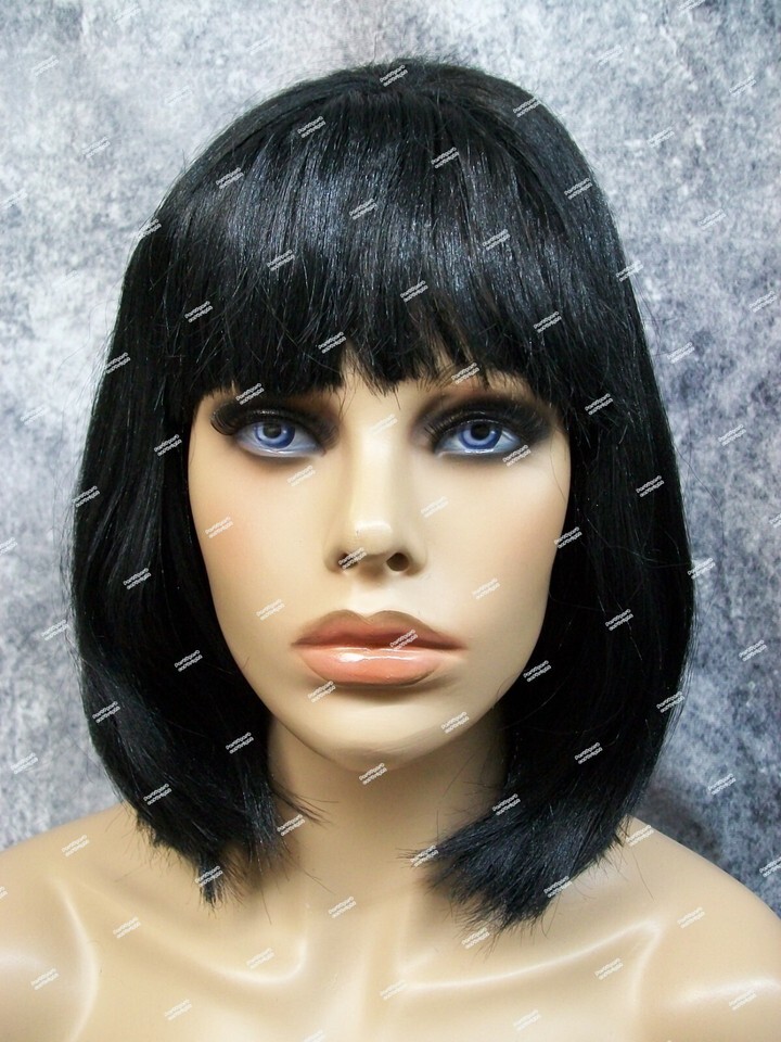 Black Wig with Bangs. This wig will require some light stuffing to create the bump. Ends can be combed under or flipped up. One side didn't want to cooperate very well. Tried to show both ways on mannequin. Some shorter crimped filler hair throughout some ends stick out. Part is messy, it kinda looks glued in the seam. It is jagged looking not completely straight. Adjust fiber to conceal net on cap if needed. Expect quite a bit of Shedding. There is hardly any stretch to the elastic on the cap. May fit loose so pinning may be necessary to secure in place. Pins not included. Does not include mannequin. For ages 14 and up.