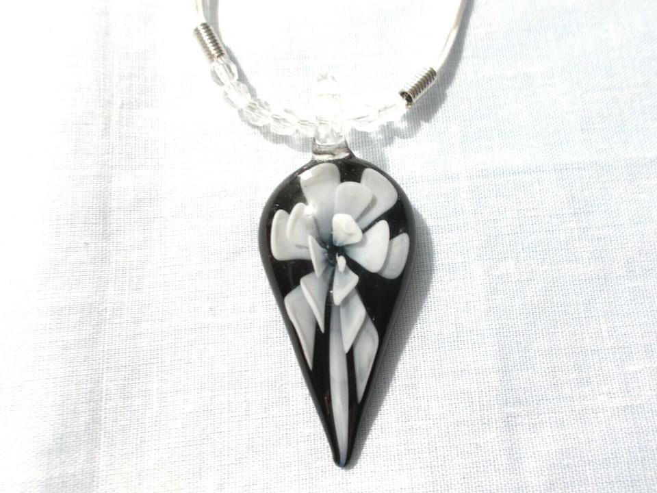 Solid GLASS UPSIDE DOWN TEARDROP SHAPED pendant - BLACK WITH WHITE PETAL BURST