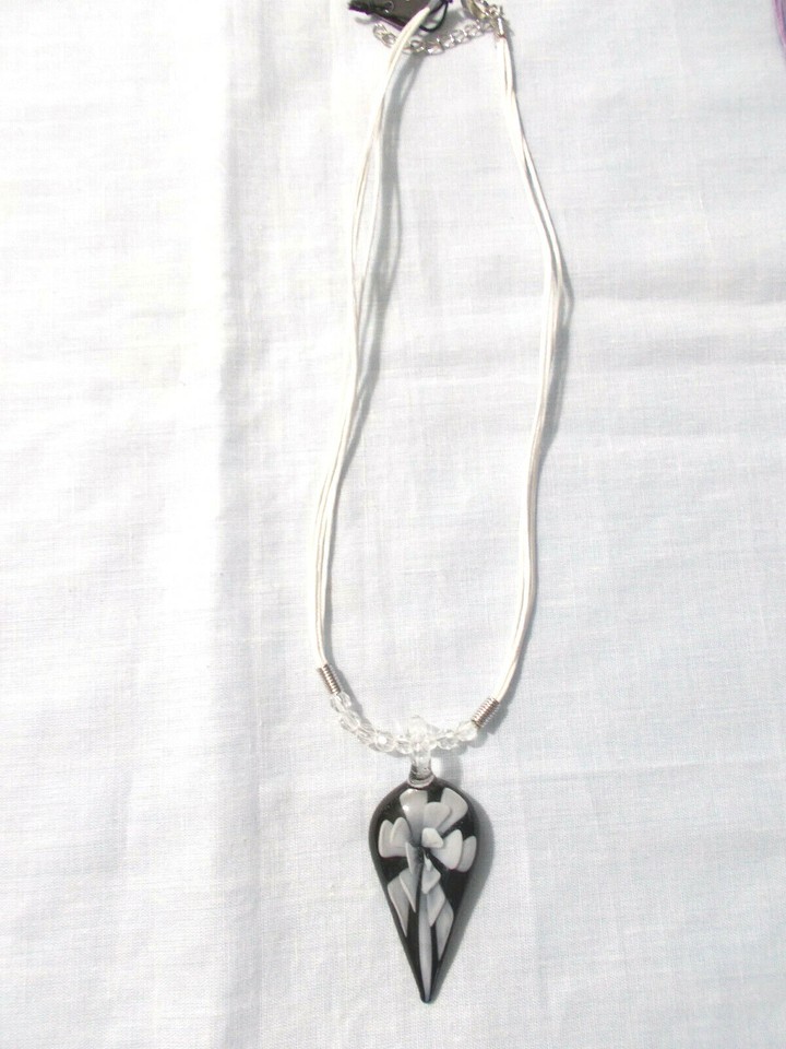 - Black and White Petals Glass Pendant on 16" 4 Strand White Cord with Crystals