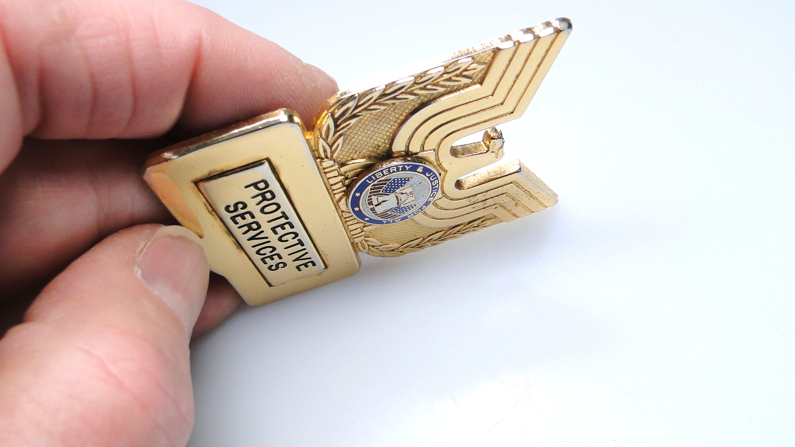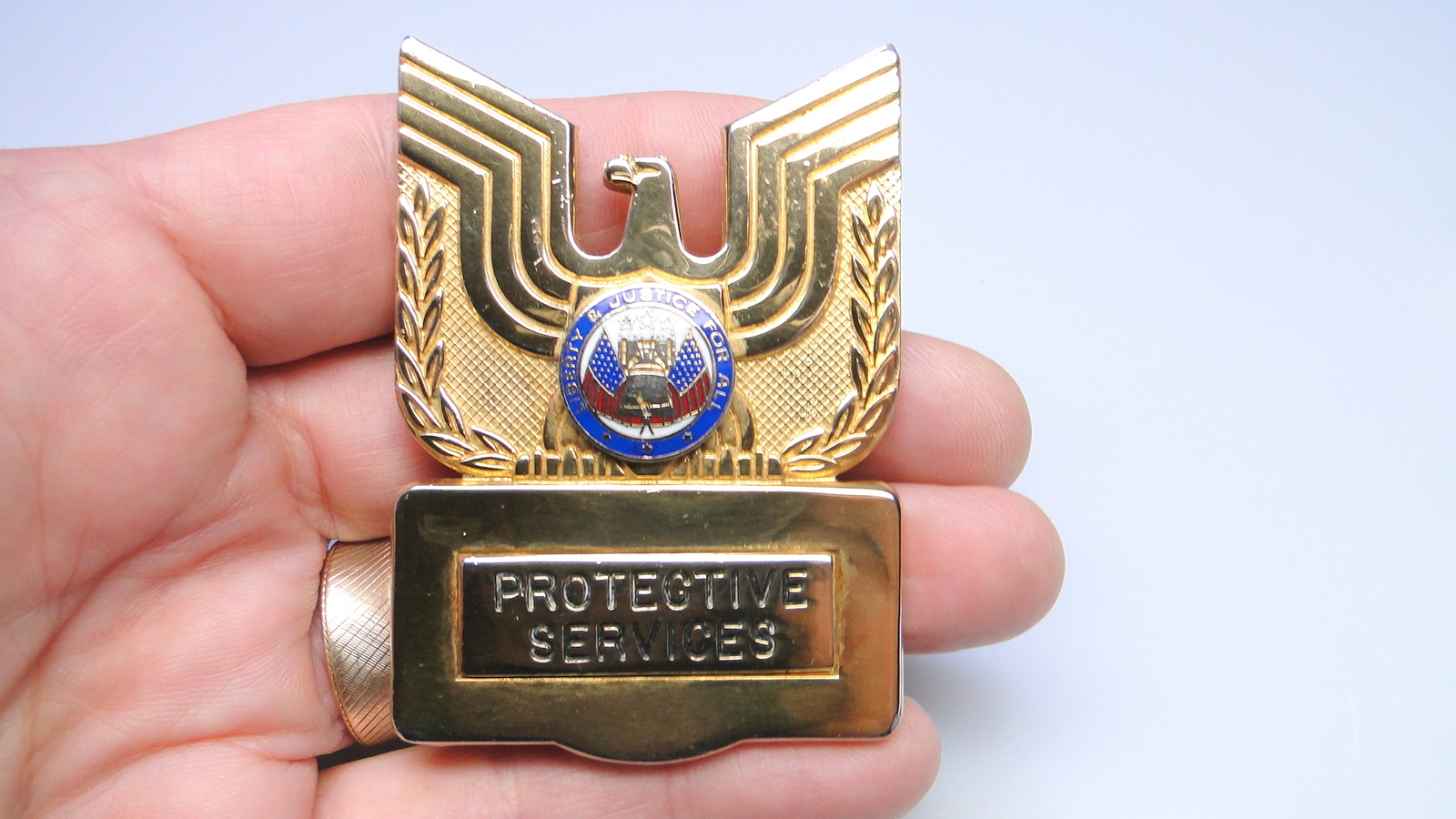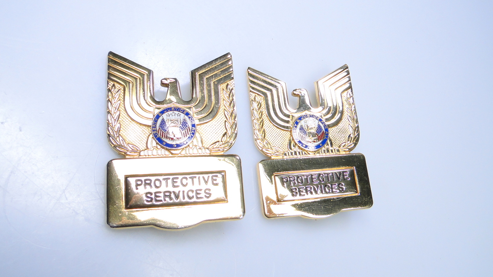 This lot is for 2 gold tone metal badges marked Protective Service with an enameled design marked Liberty Justice for All. Badges measure about 2 3/4", marked Blackinton on back. Sold as a lot only. You're getting them just as I did, good condition, normal wear or patina, sold as found. Email with questions or concerns prior to purchase. Shipping is $10.00. Final sale, no returns or refunds. Please check my seller's list for more badges from the same collection. I'd be glad to combine shipping on multiple purchases whenever possible. Thank you