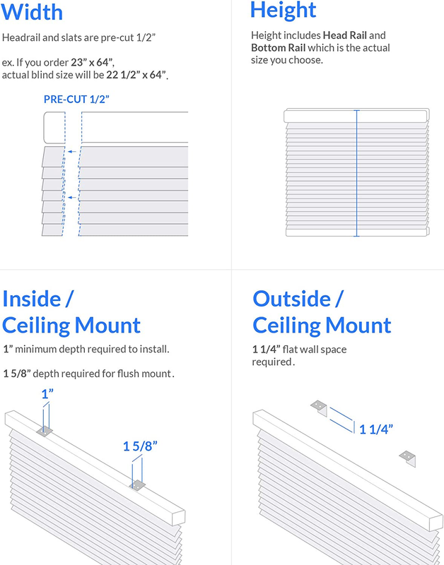 Cordless Blinds - Width has a 1/2-inch deduction. Hardware and instructions provided.