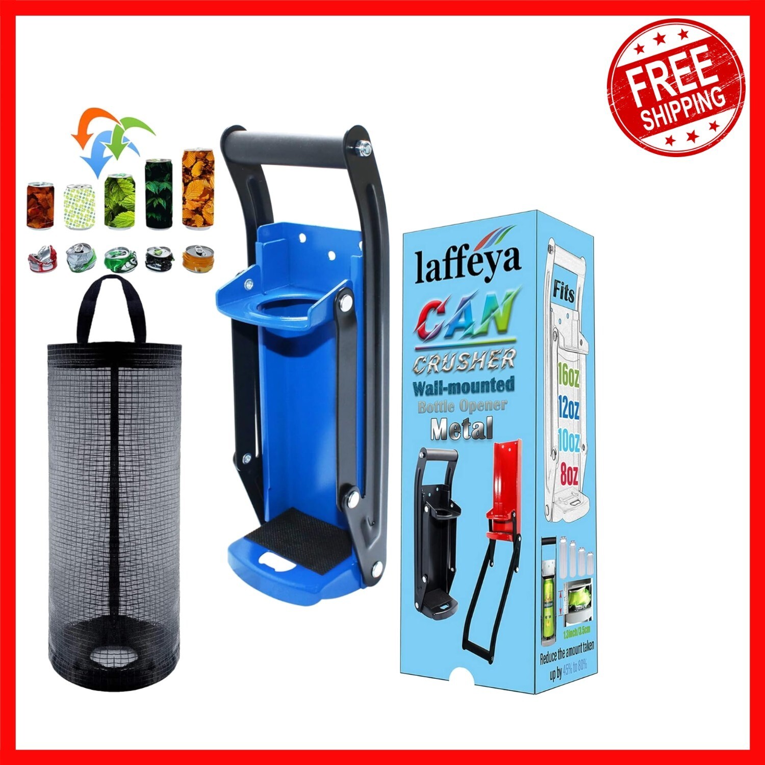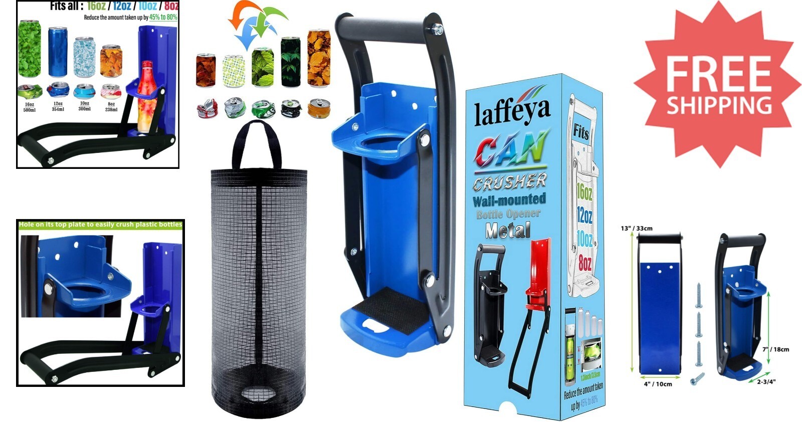 Maximize your space with the Laffeya 16oz Can Crusher, an easy-to-use and durable solution for crushing aluminum cans and bottles. Made from heavy-duty steel, it easily mounts to any solid surface with included screws, making cleanup a breeze at parties, festivals, or everyday recycling. Its compact design fits all standard 16-ounce cans and doubles as a bottle opener. Perfect for home, events, or commercial use, this tool simplifies waste management while saving space.