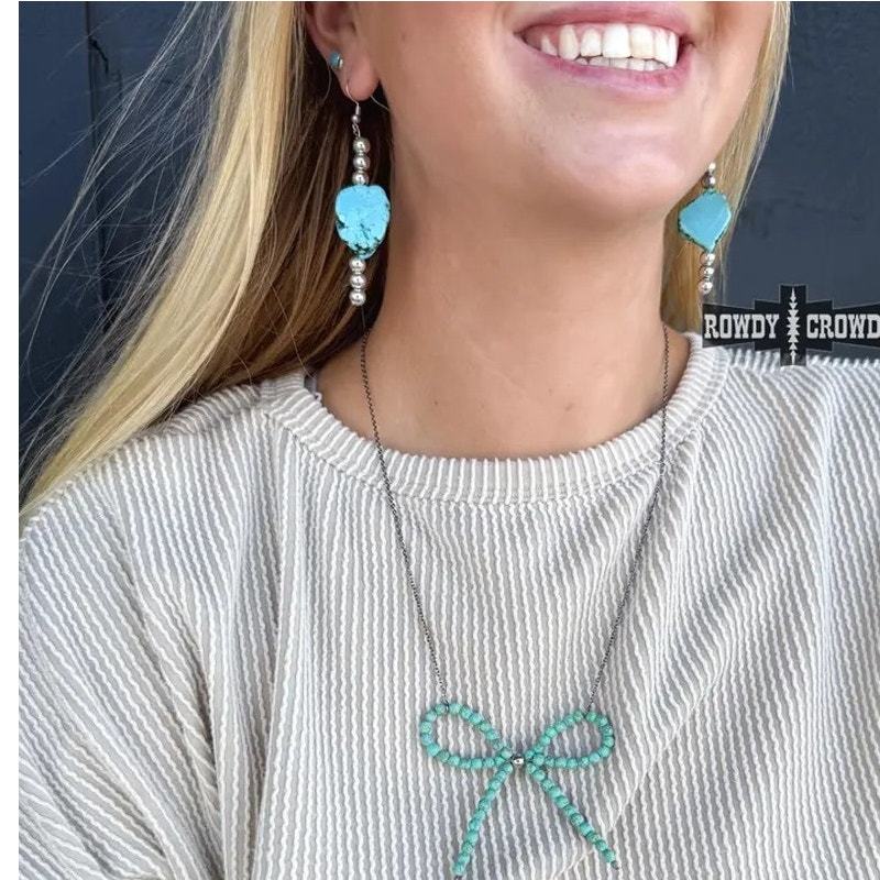 The viral pearl bow necklace is new and improved! Our Blue Bow Necklace is sterling silver featuring teal Navajo pearls shaped like a bow. This necklace truly captures the elegance and grace of the Wild West. Accent your blouses or a simple graphic tee for a laid back, stylish look.