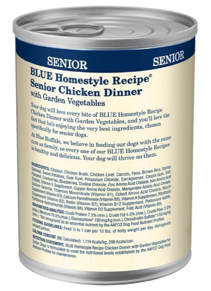REAL CHICKEN FIRST: This pat-style wet dog food features high-quality protein from real chicken to support healthy muscle maintenance FEED THREE WAYS: BLUE Homestyle Recipe senior dog food makes a delicious treat, adds interest mixed into their favorite dry foods, or can be fed as a meal on its own NATURAL DOG FOOD: All BLUE canned dog foods are made with the finest natural ingredients and enhanced with vitamins and minerals WHOLESOME INGREDIENTS: BLUE wet dog food contains NO chicken (or poultry) by-product meals, NO corn, wheat (a common thickening agent used by other brands), or soy, and NO artificial flavors or preservatives Contains one (1) 12.5 oz. can of BLUE Homestyle Recipe Natural Senior Wet Dog Food, Chicken
