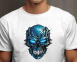 This bold t-shirt features a cyber-inspired blue skull with glowing eyes, combining futuristic and gothic elements. Perfect for fans of sci-fi and edgy, dark aesthetics.