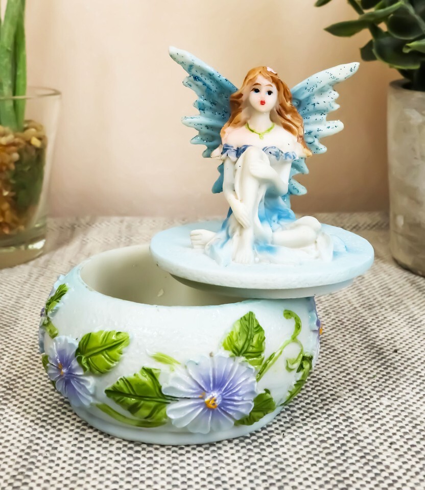 - Blue Lily Flora Fairy Garden Fae Small Round Trinket Jewelry Box Figurine 3.25"H