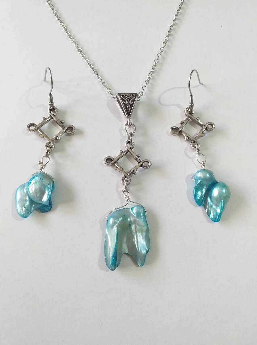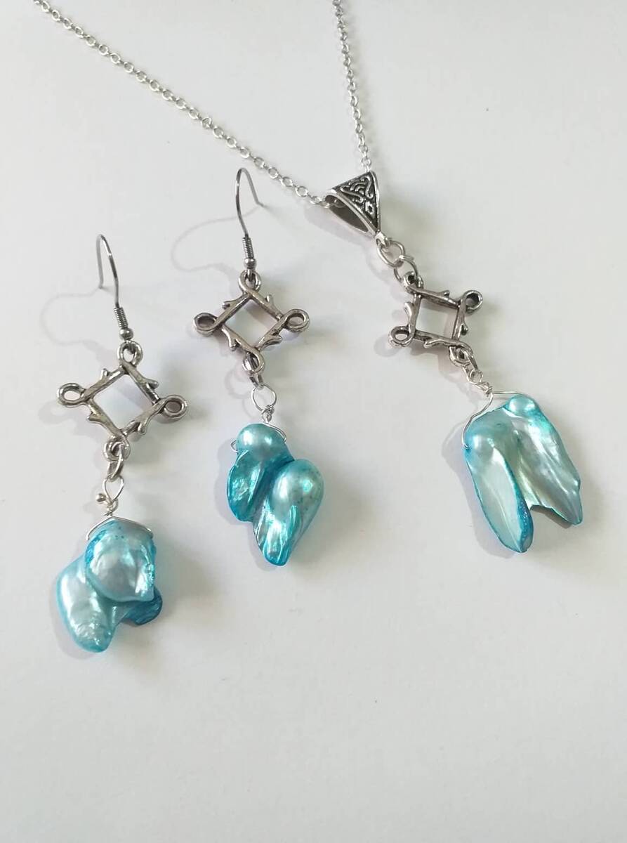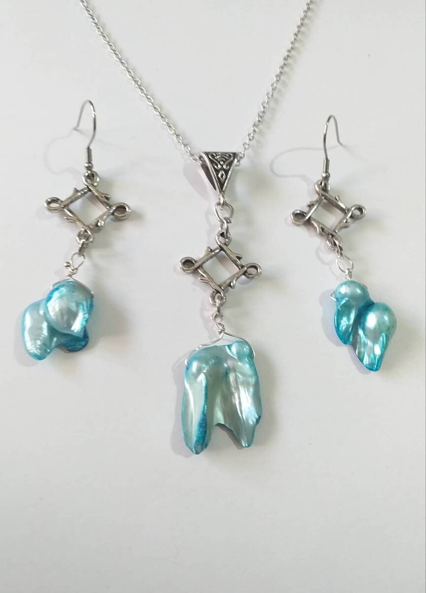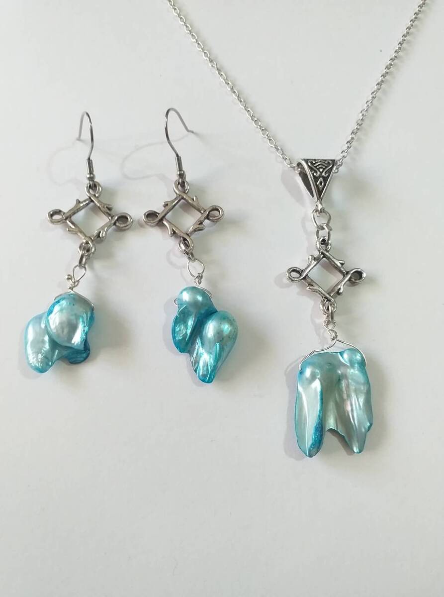 Beautiful Set of silver-tone Antique style ornaments and unique blue freshwater pearls necklace and earrings . Silver tone pendant Victorian style necklace and earrings . Boho necklace . Bohemian necklace and earrings . Romantic necklace and earrings . Beautiful necklace with same style earrings with unique blue freshwater pearls .
