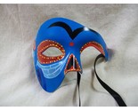 Blue Colorful Phantom Style Day of Dead Half face Costume mask. Mexican Sugar Skull Theme. Has painted unibrow. Some scuffs or scratches in the finish. Looks to be handpainted as some of the lines are wobbly with brushmarks. Each mask may vary slightly. Some excess paint on the backside. Has ribbon ties on the sides. Only covers part of the face. These types of masks are great for parties because it's easy to talk or eat, etc. Adult. On Size Fits Most. Unisex. No tags or ages specs but most costume items are for ages 14 and up. Not sure of the specific material content.