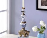 Product description: Elevate your home decor with this stunning blue porcelain and brass elephant candle holder from Interoknack. This luxurious decorative piece combines classic European artistry with playful animal symbolism, creating a statement piece for any sophisticated space. The delicately painted blue porcelain contrasts beautifully with the detailed brass elephant motif, offering both visual interest and symbolic meaning. Measuring 7.5 7.1 19.1 inches, this candlestick provides perfect proportions for dining tables, console displays, entryways, or designer vignettes. The premium hand-fired porcelain and solid brass construction ensures lasting beauty and stability, while accommodating standard taper candles for versatile styling options. Whether as a centerpiece for your living room, a distinctive accent for your dining table, or a thoughtful gift for collectors and home stylists, this elephant candle holder brings artistic elegance to any setting.