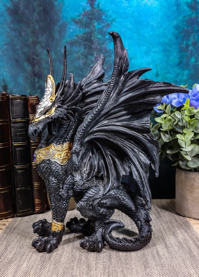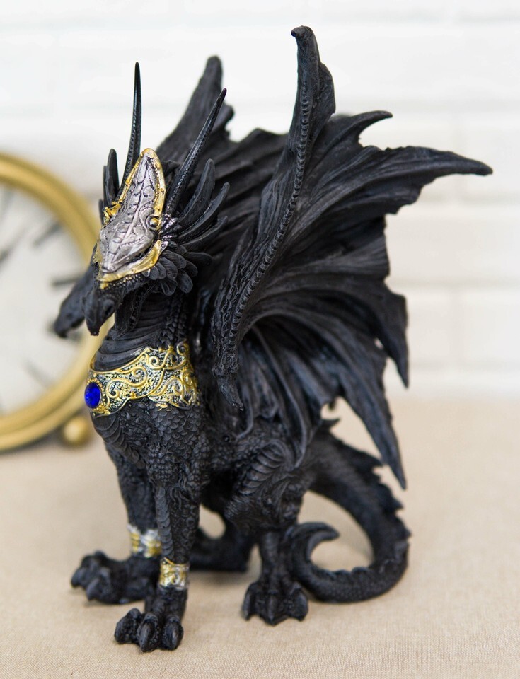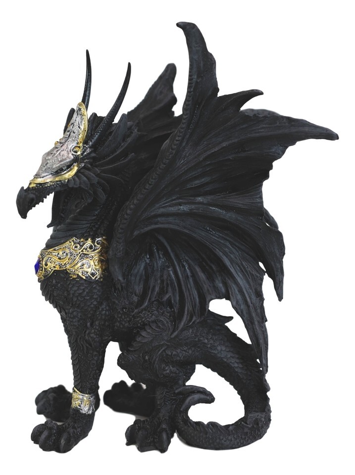 - Blue Sapphire Golden Armored Combat Dragon Standing Guard In Faux Stone Statue