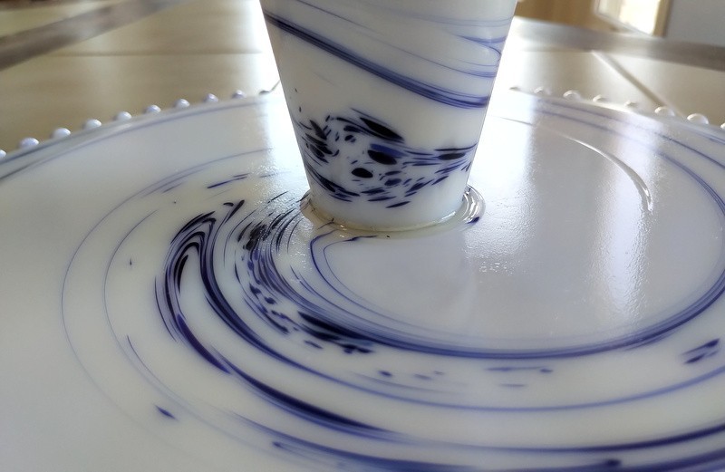 Milk glass stand has cobalt blue swirls and measures approximately 4.25" tall x 13" in diameter. No identifying markings noted.