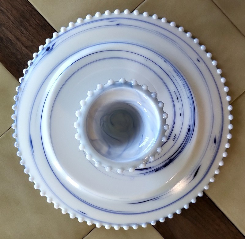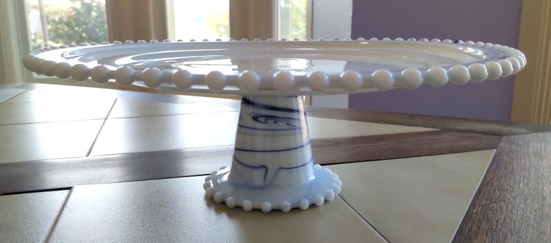 - Blue Swirl/White Milk Glass Pedestal Cake Stand w/ Beaded Hobnail Trim, 13" dia.