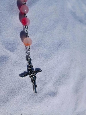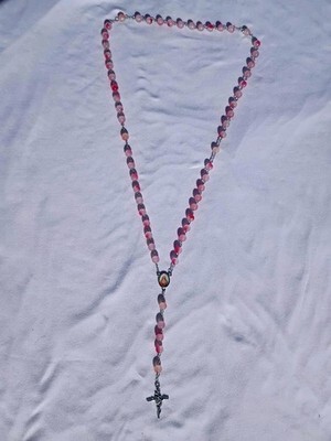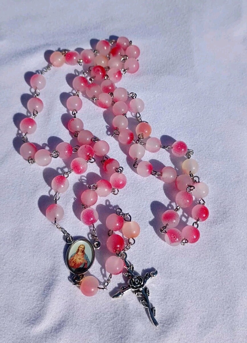 This soft and graceful rosary features blush pink frosted glass beads with gentle touches of deeper rose tones. Paired with silver-tone links, a beautiful Sacred Heart centerpiece, and a unique rose-adorned silver crucifix, this rosary carries a sweet, peaceful elegance. Perfect for daily prayer, gifting, or moments of quiet reflection.