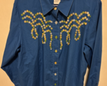 The Bob Mackie Wearable Art Western Shirt in size L for women boasts a collared neckline and button closure, perfect for a casual occasion. Made from polyester and spandex, this blue blouse features a unique art pattern and contrasting trim accents. With a regular fit and long sleeves, this top is ideal for the fall and spring seasons, showcasing a blend of art and cowboy-inspired style that is sure to make a statement. Designed by Bob Mackie, this shirt is a stylish addition to any wardrobe.