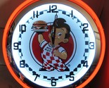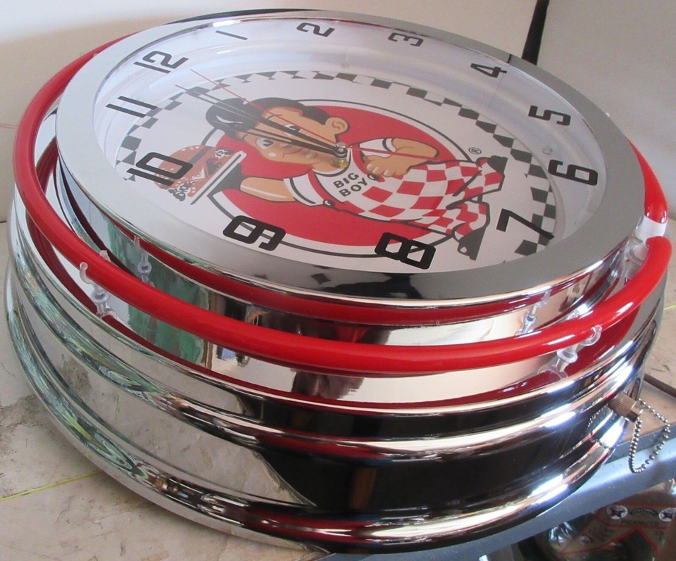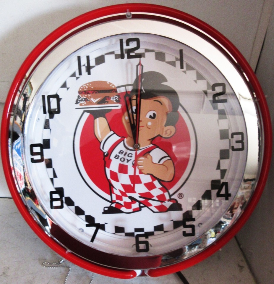 Experience a blend of vintage charm and contemporary style with the Bob's Big Boy Double Neon Clock. This striking 19-inch timepiece features a dual-faced design, each adorned with the iconic Bob's Big Boy logo, creating a classic yet eye-catching display that's perfect for any room.