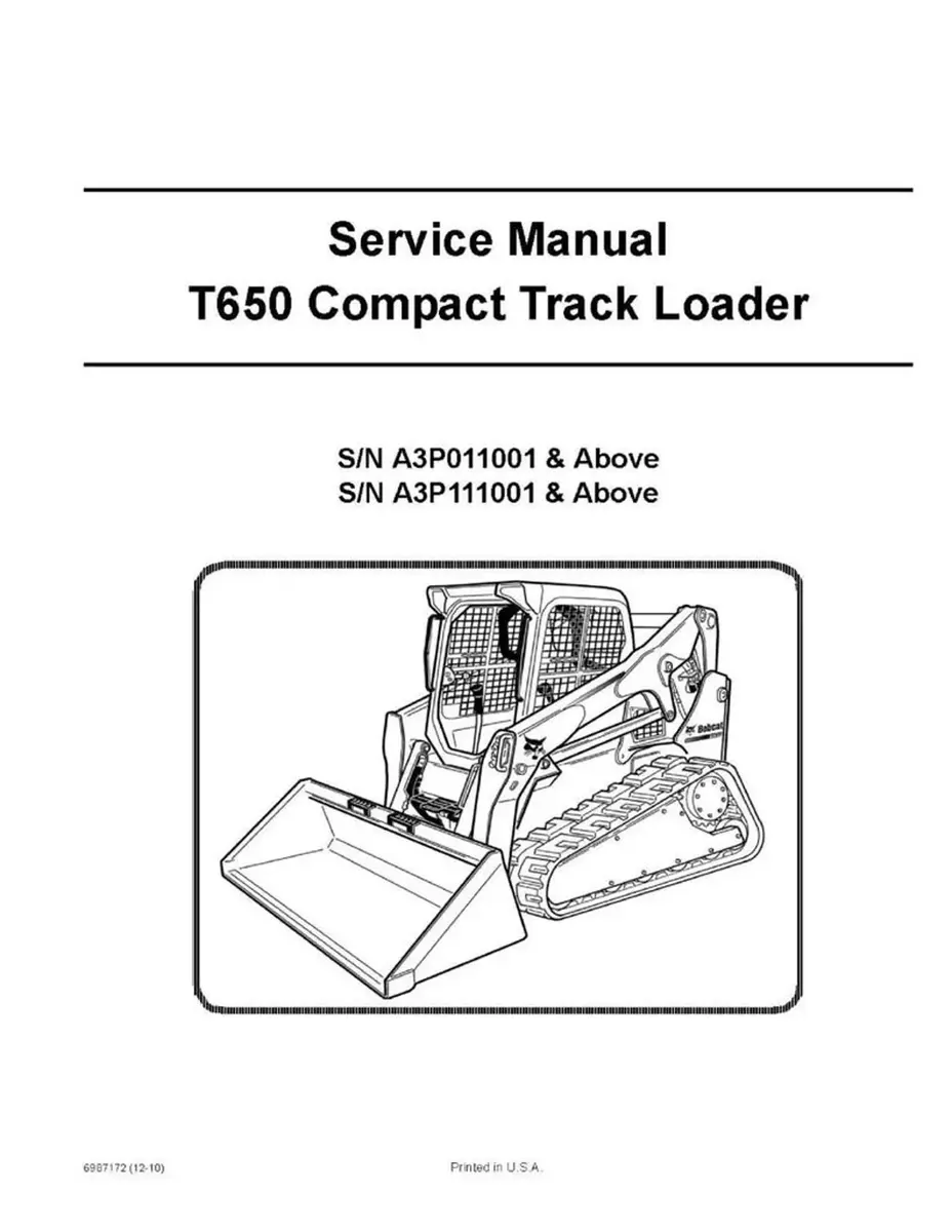 Genuine Bobcat T650 Loader Service Manual, 6987172ENUS provides the owner or operator with detailed service information including adjustments, diagnosis, disassembly, repair and reassembly instructions for the T650 Loader.